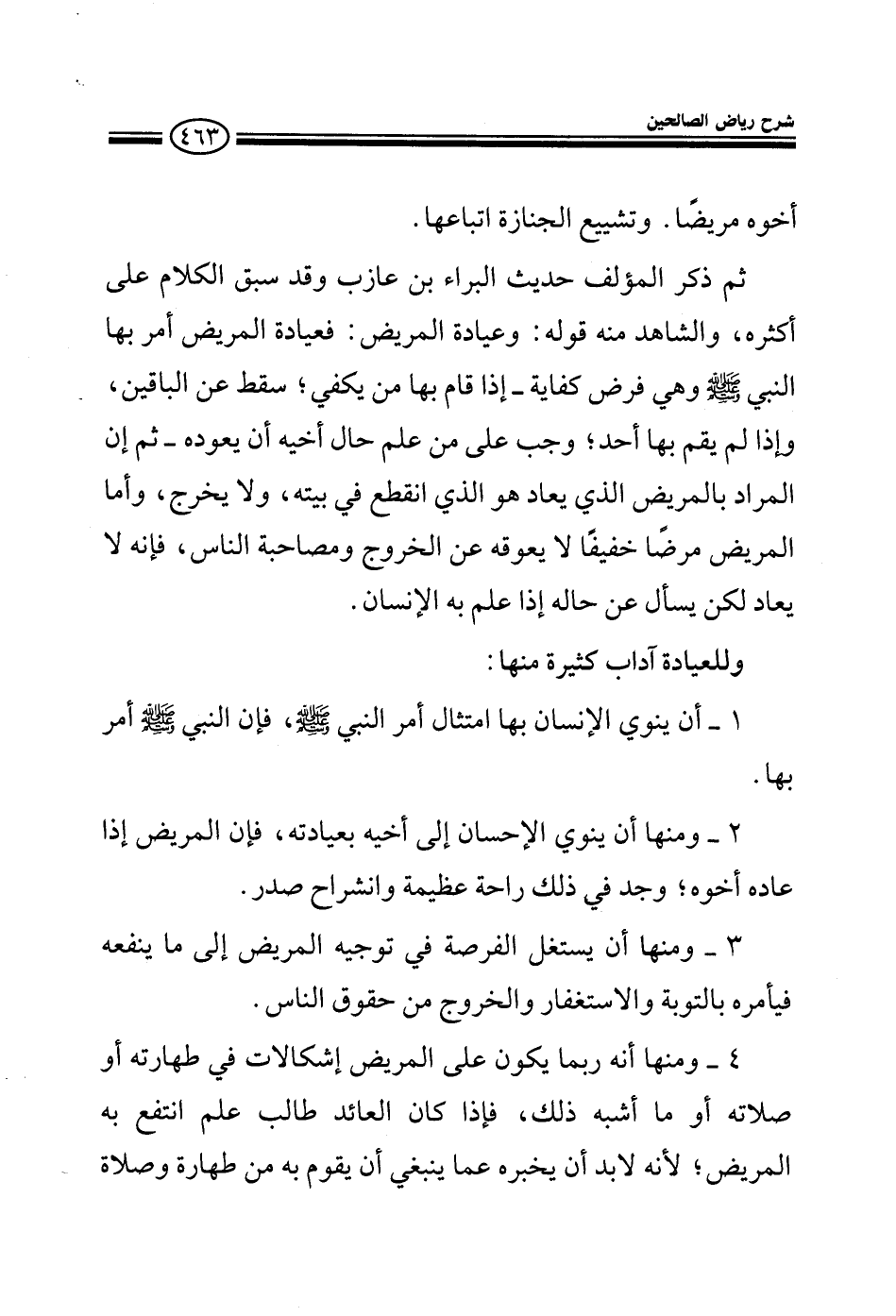 أخوه مريضا وتشييع الجنازة اتباعها ثم ذكر المؤلف حديث البراء بن عازب وقد سبق الكلام على أكثره والشاهد منه قوله وعيادة المريض فهي أمر أمر به النبي صلى الله عليه وسلم وهي فرض كفاية إذا قام بها البعض سقط عن الباقين وإذا لم يقم بها أحد وجب على من علم أن يعوده ثم إن المراد بالمريض الذي يعاد هو الذي انقطع في بيته ولا يخرج وأما المريض مرضا خفيفا لا يعوقه عن الخروج ومصاحبة الناس فإنه لا يعاد لكن يسأل عن حاله إذا علم به الإنسان وللعيادة آداب كثيرة منها 1 - أن ينوي الإنسان بها امتثال أمر النبي صلى الله عليه وسلم فإن النبي صلى الله عليه وسلم أمر بها 2 - أن ينوي الإحسان إلى أخيه بعيادته فإن المريض إذا عاده أخوه وجد في ذلك راحة عظيمة وانشراح صدر 3 - أن يستغل الفرصة في توجيه المريض إلى ما ينفعه فيأمره بالتوبة والاستغفار والخروج من حقوق الناس 4 - أنه ربما يكون على المريض إشكالات في طهارته أو صلاته أو ما أشبه ذلك فإذا كان العائد طالب علم انتفع به المريض لأنه لابد أن يخبره عما ينبغي أن يقوم به من طهارة وصلاة