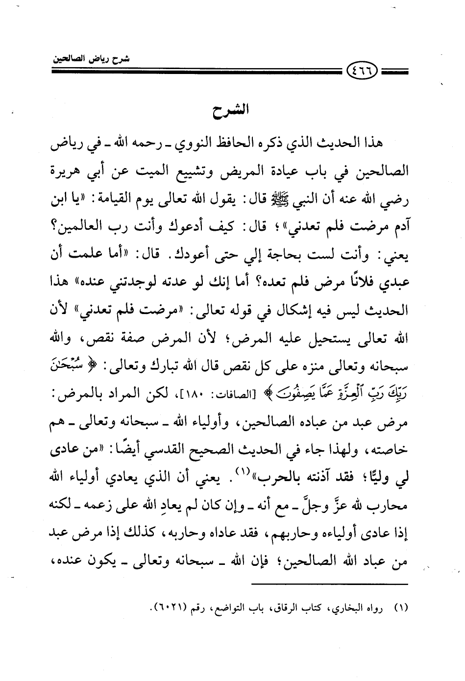 EXهذا الحديث ذكره النووي رحمه الله في رياض الصالحين باب عيادة المريض وتشييع الميت عن أبي هريرة رضي الله عنه أن النبي صلى الله عليه وسلم قال يقول الله تعالى يوم القيامة يا ابن آدم مرضت فلم تعدني قال كيف أعودك وأنت رب العالمين يعني وأنت لست بحاجة إلي حتى أعودك قال أما علمت أن عبدي فلانا مرض فلم تعده أما إنك لو عدته لوجدتني عنده هذا الحديث ليس فيه إشكال في قوله تعالى مرضت فلم تعدني لأن الله تعالى يستحيل عليه المرض لأن المرض صفة نقص والله سبحانه وتعالى منزة عن كل نقص قال الله تبارك وتعالى سبحان ربك رب العزة عما يصفون لكن المراد بالمرض مرض عبد من عباده الصالحين وأولياء الله سبحانه وتعالى هم خاصته ولهذا جاء في الحديث الصحيح القدسي أيضا من عادى لي وليا فقد آذنته بالحرب يعني من يعادي أولياء الله محارب لله عز وجل مع أنه وإن كان لم يعاد الله على زعمه لكنه عادى أولياءه وحاربهم كذلك إذا مرض عبد من عباد الله الصالحين فإن الله سبحانه وتعالى يكون عنده