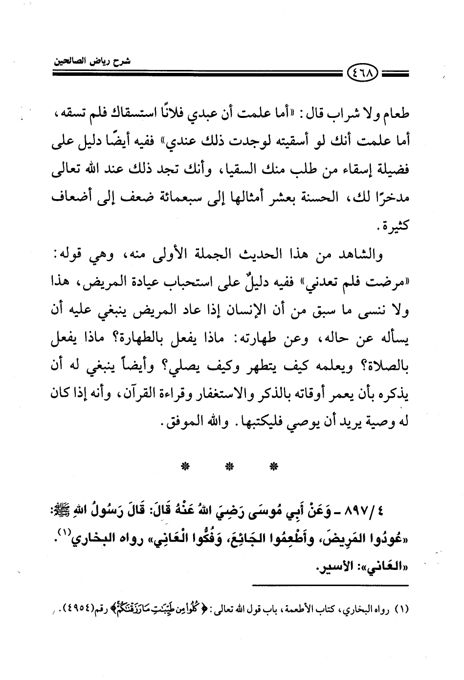 897 - وعن أبي موسى رضي الله عنه قال قال رسول الله صلى الله عليه وسلم عودوا المريض وأطعموا الجائع وفكوا العاني رواه البخاري العاني الأسير