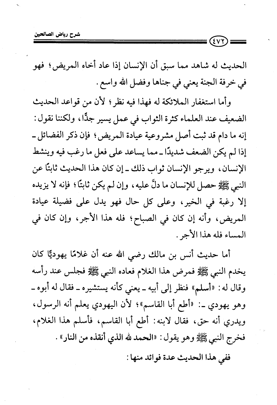 هذا الحديث له شاهد مما سبق أن الإنسان إذا عاد أخاه المريض فهو في خرفة الجنة أي في جناها وأما استغفار الملائكة له ففيه نظر لأن فضل الله واسع لكن من قواعد الحديث الضعيف عند العلماء كثرة الثواب في عمل يسير جدا لكننا نقول إنه مادام قد ثبت أصل مشروعية عيادة المريض فإن ذكر الفضائل إذا لم يكن الضعف شديدا مما يساعد على فعل ما رغب فيه وينشط الإنسان ويرجو الإنسان ثواب ذلك إن كان هذا الحديث ثابتا عن النبي صلى الله عليه وسلم حصل للإنسان ما دل عليه وإن لم يكن ثابتا فإنه لا يزيده إلا رغبة في الخير وعلى كل حال فهو يدل على فضيلة عيادة المريض وأنه إذا كان في الصباح فله هذا الأجر وإذا كان في المساء فله هذا الأجر أما حديث أنس بن مالك رضي الله عنه أن غلاما يهوديا كان يخدم النبي صلى الله عليه وسلم فمرض الغلام فعاده النبي صلى الله عليه وسلم وجلس عند رأسه وقال له أسلم فنظر إلى أبيه يعني كأنه يستشيره فقال له أبوه وهو يهودي أطع أبا القاسم لأن اليهودي يعلم أنه حق فقال لابنه أطع أبا القاسم فأسلم هذا الغلام فخرج النبي صلى الله عليه وسلم وهو يقول الحمد لله الذي أنقذه من النار ففي هذا الحديث عدة فوائد منها