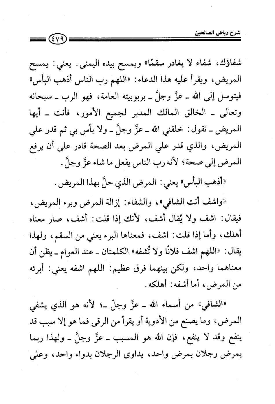 شفاؤك شفاء لا يغادر سقما ويمسح بيده اليمنى أي يمسح المريض ويقرأ عليه هذا الدعاء اللهم رب الناس فيتوسل إلى الله عز وجل بربوبيته العامة فهو الرب سبحانه وتعالى الخالق المالك المدبر لجميع الأمور فأنت أيها المريض تقول خلقني الله عز وجل ولا بأس بي ثم قدر علي المرض والذي قدر علي المريض بعد الصحة قادر على أن يشفيني أذهب البأس يعني المرض الذي حل بهذا المريض.