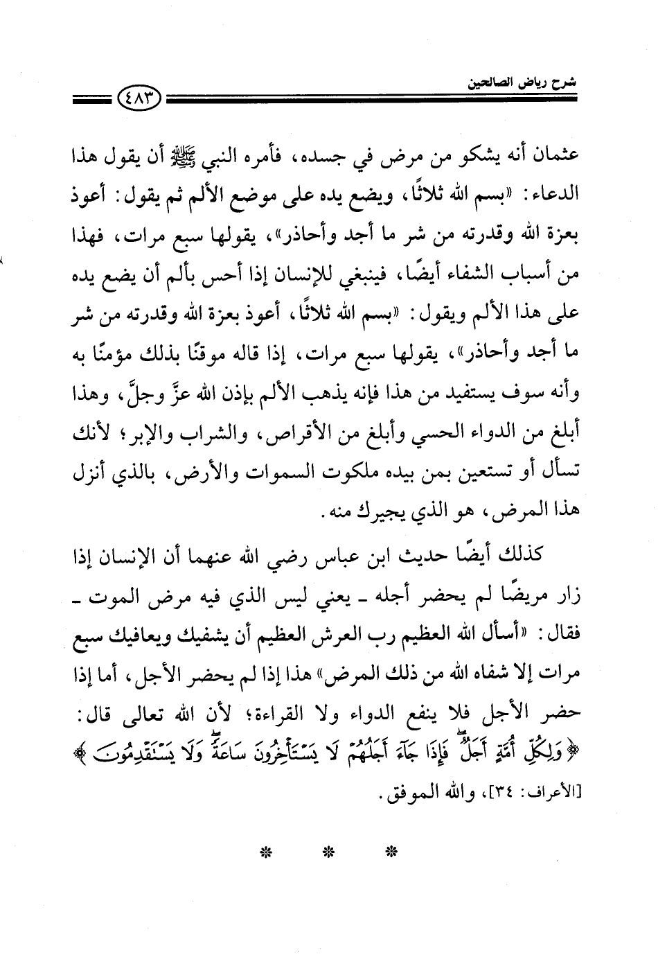 عثمان أنه يشكو من مرض في جسده فأمره النبي صلى الله عليه وسلم أن يقول هذا الدعاء بسم الله ثلاثا ويضع يده على موضع الألم ثم يقول أعوذ بعزة الله وقدرته من شر ما أجد وأحاذر يقولها سبع مرات فهذا من أسباب الشفاء أيضا فينبغي للإنسان إذا أحس بألم أن يضع يده على هذا الألم ويقول بسم الله ثلاثا أعوذ بعزة الله وقدرته من شر ما أجد وأحاذر يقولها سبع مرات إذا قاله موقنا بذلك مؤمنا به وأنه سوف يستفيد من هذا فإنه يسكن الألم بإذن الله عز وجل وهذا أبلغ من الدواء الحسي كالأقراص والشراب والحقن لأنك تستعيذ بمن بيده ملكوت السماوات والأرض الذي أنزل هذا المرض هو الذي يجيرك منه كذلك أيضا حديث ابن عباس أن الإنسان إذا زار مريضا لم يحضر أجله أي ليس الذي فيه مرض الموت فقال أسأل الله العظيم رب العرش العظيم أن يشفيك سبع مرات إلا شفاه الله من هذا المرض هذا إذا لم يحضر الأجل أما إذا حضر الأجل فلا ينفع الدواء ولا القراءة لأن الله تعالى قال ولكل أمة أجل فإذا جاء أجلهم لا يستأخرون ساعة ولا يستقدمون والله الموفق