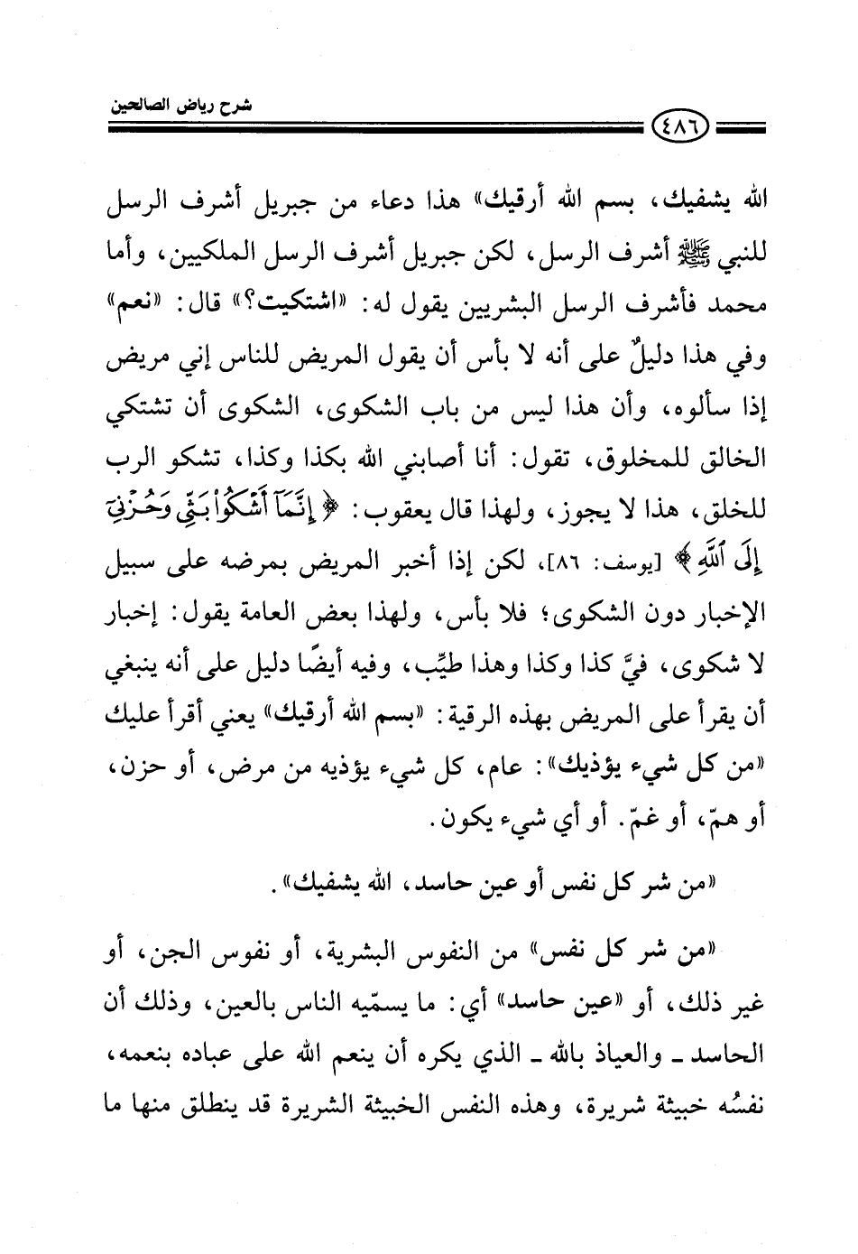 الله يشفيك بسم الله أرقيك هذا دعاء من جبريل أشرف الرسل للنبي صلى الله عليه وسلم أشرف الرسل لكن جبريل أشرف الرسل الملكيين وأما محمد صلى الله عليه وسلم فأشرف الرسل البشريين يقول له اشتكيت قال نعم وفي هذا دليل على أنه لا بأس أن يقول المريض للناس إني مريض إذا سألوه وأن هذا ليس من باب الشكوى، الشكوى أن تشتكي الخالق للمخلوق تقول أنا أمرضني الله بكذا وكذا تشكو الرب للخلق هذا لا يجوز ولهذا قال يعقوب إنما أشكو بثي وحزني إلى الله لكن إذا أخبر المريض بمرضه على سبيل الإخبار لا الشكوى فلا بأس ولهذا بعض العامة يقول إخبار لا شكوى وهذا طيب.