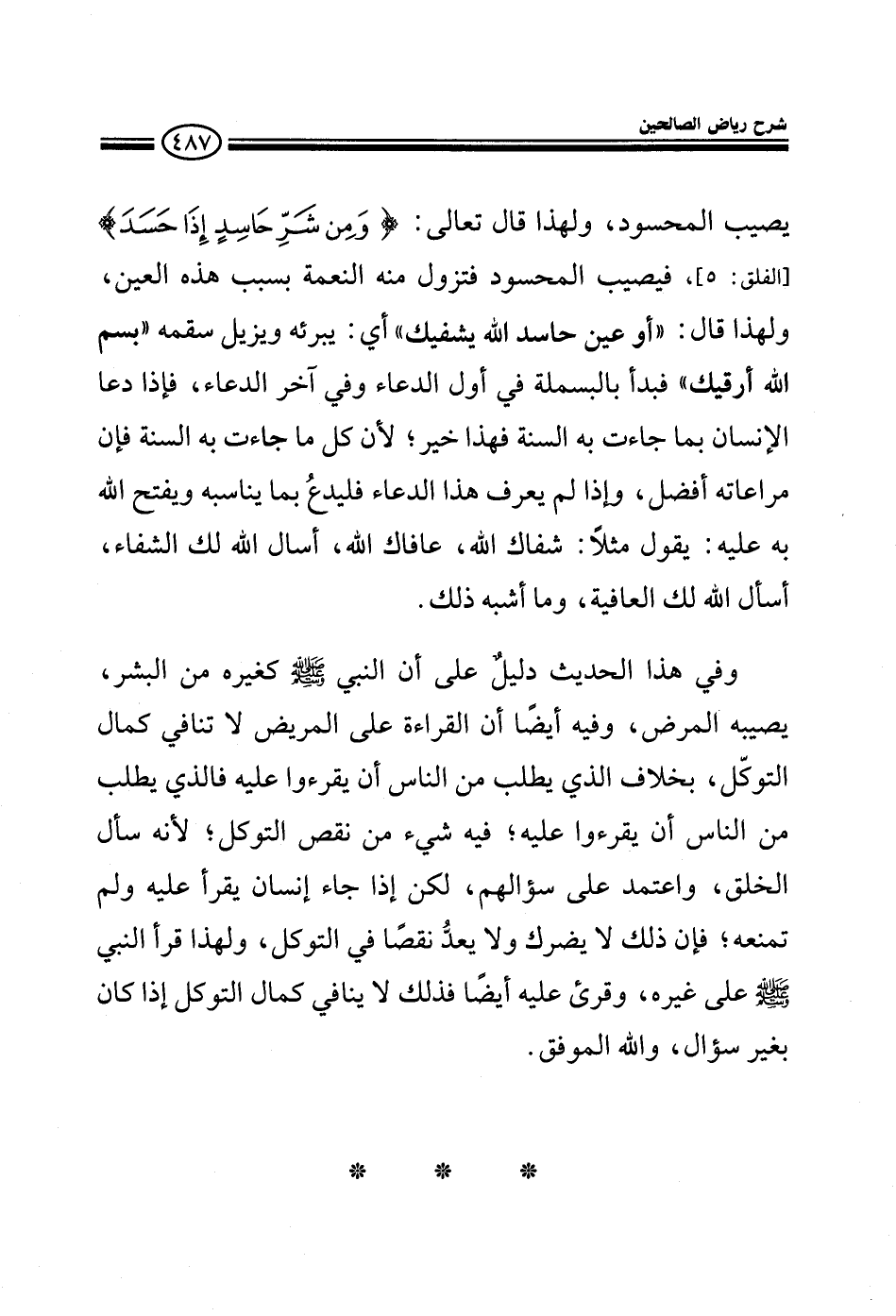 وفي هذا الحديث دليل على أن النبي صلى الله عليه وسلم كغيره من البشر يصيبه المرض وفيه أيضا أن القراءة على المريض لا تنافي كمال التوكل بخلاف الذي يطلب من الناس أن يقرءوا عليه ففيه شيء من نقص التوكل لأنه سأل الخلق واعتمد على سؤالهم لكن إذا جاء إنسان يقرأ عليه ولم تمنعه فإن ذلك لا شيء فيه ولا يعد نقصا في التوكل ولهذا قرأ النبي صلى الله عليه وسلم على غيره وقرئ عليه أيضا فذلك لا ينافي كمال التوكل إذا كان بغير سؤال.