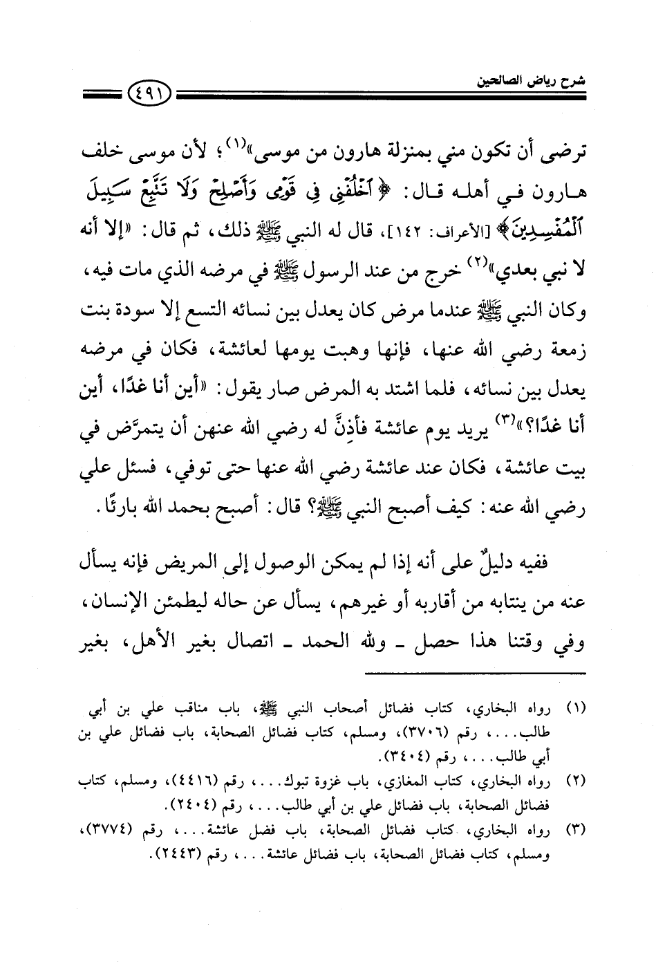 ترضي أن تكون مني بمنزلة هارون من موسى لأن موسى خلف هارون على أهله قال اخلفني في قومي وأصلح ولا تتبع سبيل المفسدين قال له النبي صلى الله عليه وسلم أما ترضي أن تكون مني بمنزلة هارون من موسى إلا أنه لا نبي بعدي خرج من عند الرسول صلى الله عليه وسلم في مرضه الذي مات فيه وكان النبي صلى الله عليه وسلم عندما مرض يعدل بين نسائه التسع إلا سودة بنت زمعة فإنها وهبت يومها لعائشة فلما اشتد به المرض صار يقول أين أنا غدا أين أنا غدا يريد يوم عائشة فأذن له رضي الله عنهن أن يمرض في بيت عائشة وظل عندها رضي الله عنها حتى توفي فسئل علي رضي الله عنه كيف أصبح النبي صلى الله عليه وسلم قال أصبح بحمد الله بارئا ففيه دليل على أنه إذا لم يمكن الوصول إلي المريض فإنه يسأل عنه من يراه من