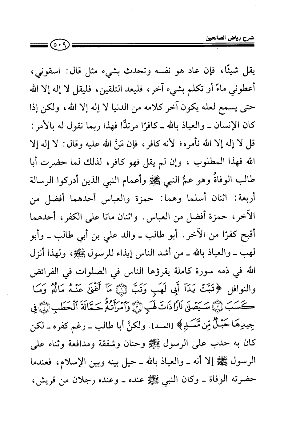 يقل شيئا فإن عاد المحتضر نفسه وتحدث في شيء مثل اسقوني أعطوني ماء أو أي شيء آخر فليعد التلقين ولكن إذا كان الإنسان والعياذ بالله كافرا مرتدا فهذا ربما نقول له بالأمر: قل لا إله إلا الله فإن من الله عليه وقالها فبها ونعمت وإن لم يقل فهو كافر لذلك لما حضرت أبا طالب الوفاة وهو عم النبي صلى الله عليه وسلم وأعمام النبي صلى الله عليه وسلم الذين أدركوا الرسالة أربعة اثنان أسلما حمزة والعباس أحدهما أفضل من الآخر حمزة أفضل من العباس واثنان ماتا على الكفر أحدهما أقبح كفرا من الآخر أبو طالب والد علي وأبو لهب والعياذ بالله من أشد الناس إيذاء للرسول صلى الله عليه وسلم ولهذا أنزل الله في ذمه سورة كاملة يقرأها الناس في الصلوات في الفرائض والنوافل {تبت يدا أبي لهب وتب ما أغنى عنه ماله وما كسب سيصلى نارا ذات لهب وامرأته حمالة الحطب في جيدها حبل من مسد} ولكن أبا طالب رغم كفره كان به حب على الرسول صلى الله عليه وسلم وحنان وشفقة ومدافعة وثناء عليه إلا أنه والعياذ بالله حيل بينه وبين الإسلام فعندما حضرته الوفاة وكان النبي صلى الله عليه وسلم عنده وعنده رجلان من قريش