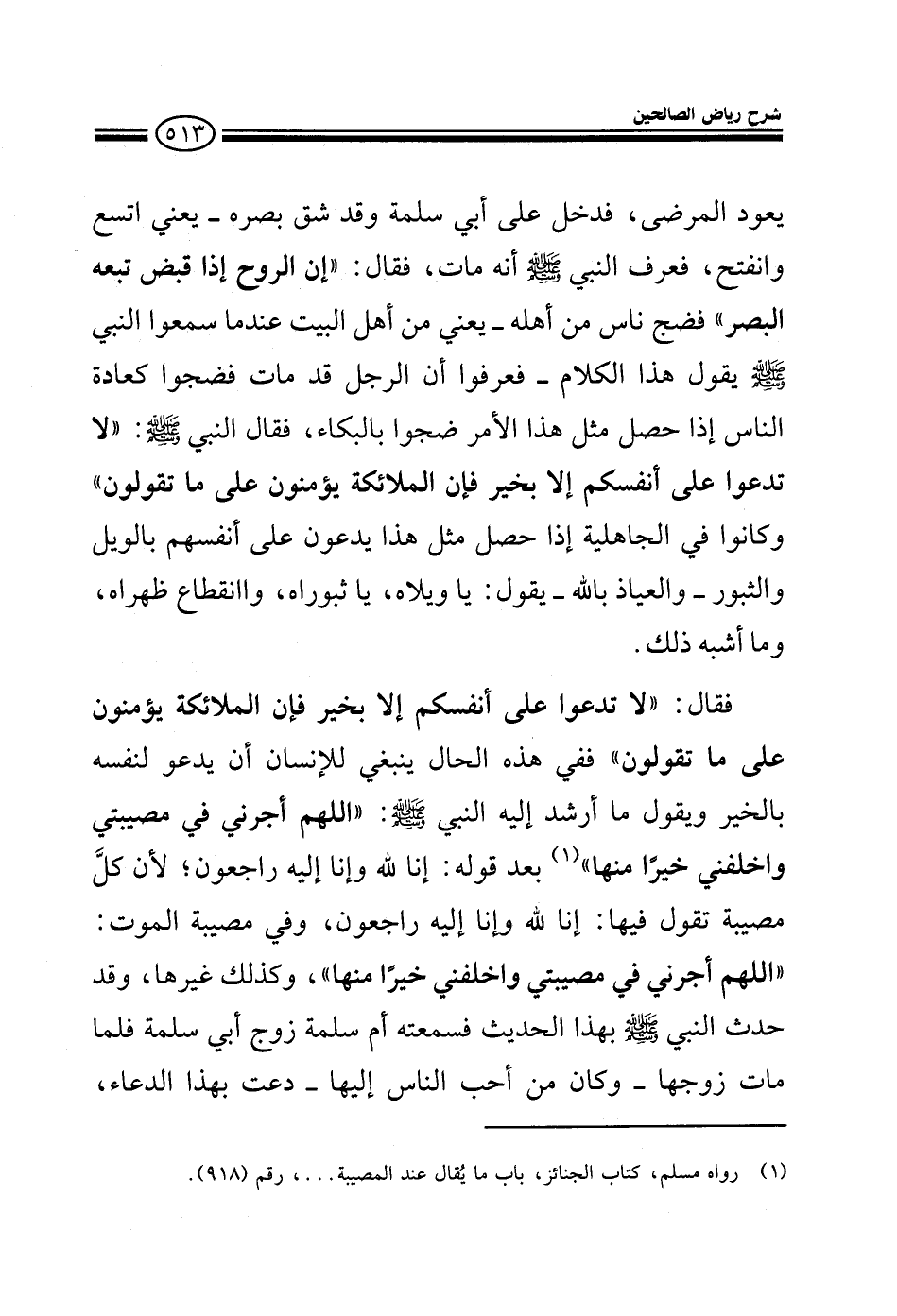 يعود المرضى فدخل عليه وقد شق بصره يعني اتسع وانفتح فعرف النبي صلى الله عليه وسلم أنه مات فقال إن الروح إذا قبض أتبعه البصر فضج ناس من أهله أي من أهل الميت عندما سمعوا النبي صلى الله عليه وسلم يقول هذا الكلام فعرفوا أن الرجل قد مات فضجوا كعادة الناس فقال صلى الله عليه وسلم لا تدعوا على أنفسكم إلا بخير فإن الملائكة يؤمنون على ما تقولون وكانوا في الجاهلية إذا حصل مثل هذا يدعون على أنفسهم بالويل والثبور والعياذ بالله يقولون يا ويلاه يا ثبوراه وما أشبه ذلك فقال لا تدعوا على أنفسكم إلا بخير فإن الملائكة يؤمنون على ما تقولون ففي هذه الحالة ينبغي للإنسان أن يدعو لنفسه بالخير ويقول ما أرشد إليه النبي صلى الله عليه وسلم اللهم أجرني في مصيبتي واخلف لي خيرا منها بعد قوله أنا لله وإنا إليه راجعون لأن كل مصيبة تقول إنا لله وإنا إليه راجعون وفي مصيبة الموت اللهم أجرني في مصيبتي واخلف لي خيرا منها وكذلك غيرها وقد حدث النبي صلى الله عليه وسلم بهذا الحديث فسمعته أم سلمة زوج أبي سلمة فلما مات زوجها وكان من أحب الناس إليها دعت بهذا الدعاء