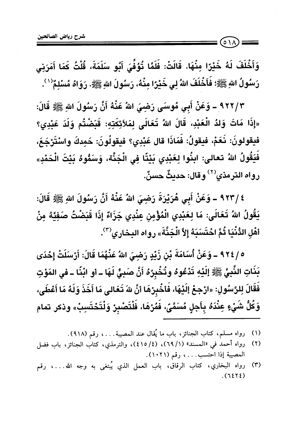 924 - وعن أسامة بن زيد رضي الله عنهما قال أرسلت إحدى بنات النبي صلى الله عليه وسلم إليه تدعوه وتخبره أن صبيا لها أو ابنا في الموت فقال للرسول ارجع إليها فأخبرها أن لله تعالى ما أخذ وله ما أعطى وكل شيء عنده بأجل مسمى فمرها فلتصبر ولتحتسب وذكر تمام