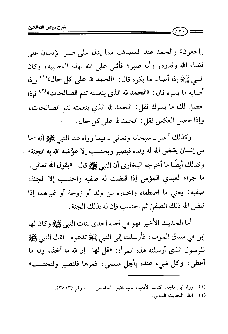 راجعون والحمد عند المصائب مما يدل على صبر الإنسان على قضائه وقدره وأنه صبر فأثنى على الله بصبره على هذه المصيبة وكان النبي صلى الله عليه وسلم إذا أصابه ما يكره قال الحمد لله على كل حال وإذا أصابه ما يسره قال الحمد لله الذي بنعمته تتم الصالحات فإذا حصل لك ما يسرك فقل الحمد لله الذي بنعمته تتم الصالحات وإذا حصل العكس فقال الحمد لله على كل حال وكذلك أخبر سبحانه وتعالى فيما رواه عنه النبي صلى الله عليه وسلم أنه ما من إنسان يقبض الله له ولده فيصبر ويحتسب إلا عوضه الله به الجنة وكذلك أيضا ما أخرجه البخاري أن النبي صلى الله عليه وسلم قال يقول الله تعالى ما لعبدي المؤمن جزاء إذا قبضت صفيه واحتسب إلا الجنة صفيه يعني من اصطفاه واختاره من ولد وزوجة أو غيرهما أما الحديث الأخير فهو في قصة لإحدى بنات النبي صلى الله عليه وسلم كان لها صبي في سياق الموت فأرسلت إلى النبي صلى الله عليه وسلم فقال النبي صلى الله عليه وسلم للرسول الذي أرسلته إليه قل لها إن لله ما أخذ وله ما أعطى وكل شيء عنده بأجل مسمى فمرها فلتصبر ولتحتسب