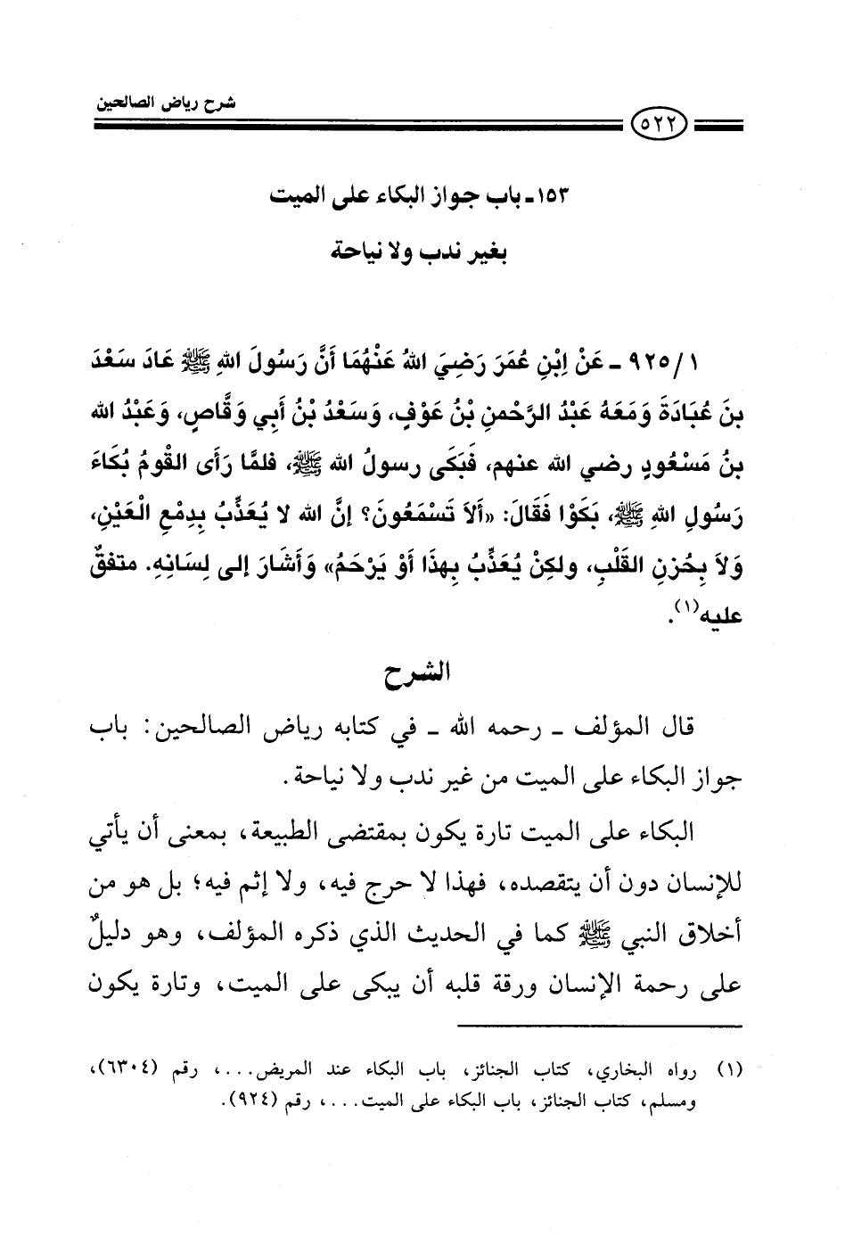 باب جواز البكاء على الميت بغير ندب ولا نياحة أما النياحة فحرام وسيأتي فيها باب في كتاب النهي إن شاء الله تعالى وأما البكاء فجاءت أحاديث كثيرة بالنهي عنه وأن الميت يعذب ببكاء أهله وهي متأولة ومحمولة على من أوصى به والنهي إنما هو عن البكاء الذي فيه ندب أو نياحة والدليل على جواز البكاء بغير ندب ولا نياحة أحاديث كثيرة منها