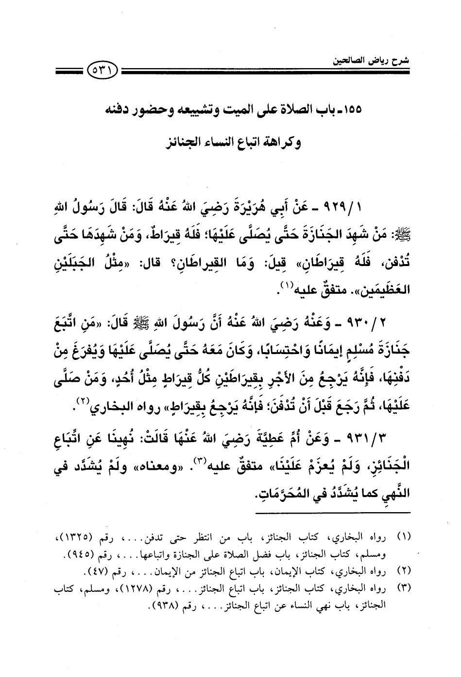 931 - وعن أم عطية رضي الله عنها قالت نهينا عن اتباع الجنائز ولم يعزم علينا متفق عليه ومعناه ولم يشدد في النهي كما يشدد في المحرمات