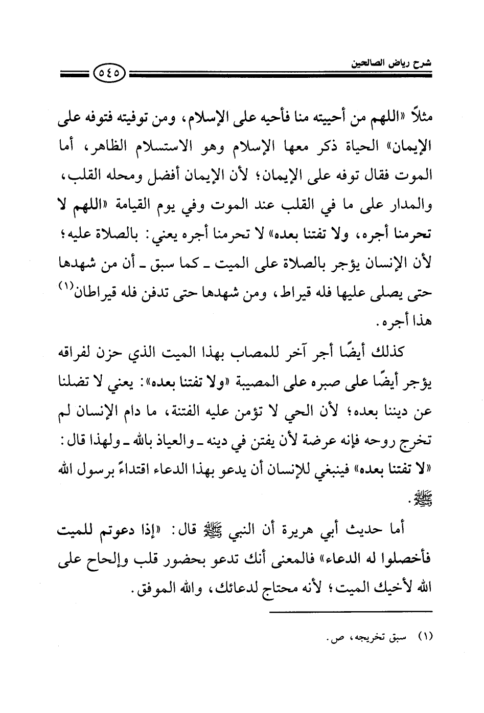 مثلا اللهم من أحييته منا فأحيه على الإسلام ومن توفيته فتوفه على الإيمان الحياة ذكر معها الإسلام وهو الاستسلام الظاهر وأما الموت قال توفنا على الإيمان لأن الإيمان أفضل ومحله القلب والمدار على ما في القلب عند الموت وفي يوم القيامة اللهم لا تحرمنا أجره ولا تفتنا بعده لا تحرمنا أجره يعني بالصلاة عليه لأن الإنسان يؤجر بالصلاة على الميت كما سبق أن من شهدها حتى يصلى عليها فله قيراط ومن شهدها حتى تدفن فله قيراطان كذلك أيضا أجر آخر للمصاب بهذا الميت الذي حزن لفراقه يؤجر أيضا على صبره على المصيبة ولا تفتنا بعده يعني لا تضلنا عن ديننا بعده لأن الحي لا تؤمن عليه الفتنة مادام الإنسان لم يخرج روحه فإنه عرضة لأن يفتن في دينه والعياذ بالله ولهذا قال لا تفتنا بعده فينبغي للإنسان أن يدعو بهذا الدعاء اقتداء برسول الله صلى الله عليه وسلم.