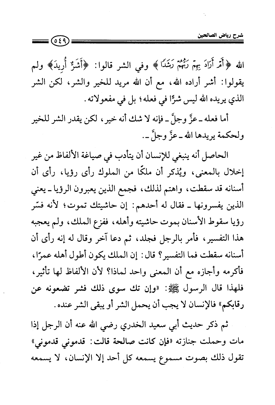 المهم أنه ينبغي للإنسان أن يتأدب في صياغة الألفاظ من غير إخلال بالمعنى ويذكر أن ملكا من الملوك رأى رؤيا وهي أن أسنانه قد سقطت واهتم لذلك فجمع الذين يعبرون الرؤيا أي يفسرونها فقال له واحد إن حاشيتك تموت وأهلك معهم ففزع الملك ولم يعجبه هذا التفسير فأمر بالرجل فجلد ثم دعا آخر وقال له ما أرى قال إن الملك يكون أطول أهله عمرا المعنى واحد فأكرمه وأجازه فالألفاظ لها تأثير ولهذا قال الرسول صلى الله عليه وسلم وإن تك سوى ذلك فشر تضعونه عن رقابكم.
