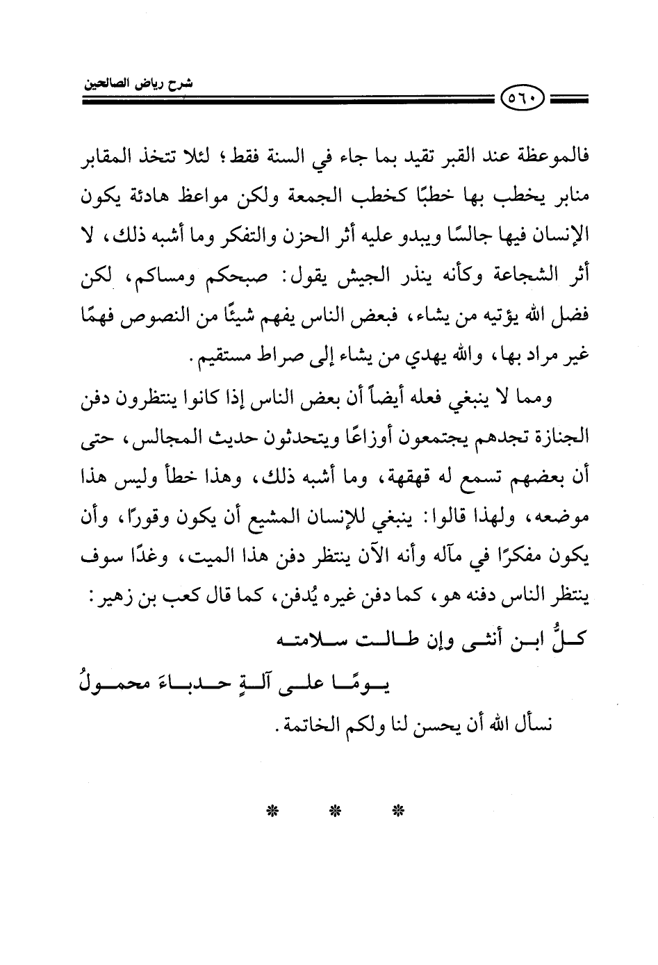 الموعظة عند القبر تقيد بما جاء في السنة فقط لئلا تتخذ المقابر منابر فالمواعظ هادئة يكون الإنسان فيها جالسا ويبدو عليه أثر الحزن والتفكر وما أشبه ذلك لا أثر الشجاعة وكأنه ينذر الجيش يقول صبحكم ومساكم لكن فضل الله يؤتيه من يشاء فبعض الناس يفهم شيئا من النصوص فهما غير مراد بها والله يهدي من يشاء إلى صراط مستقيم