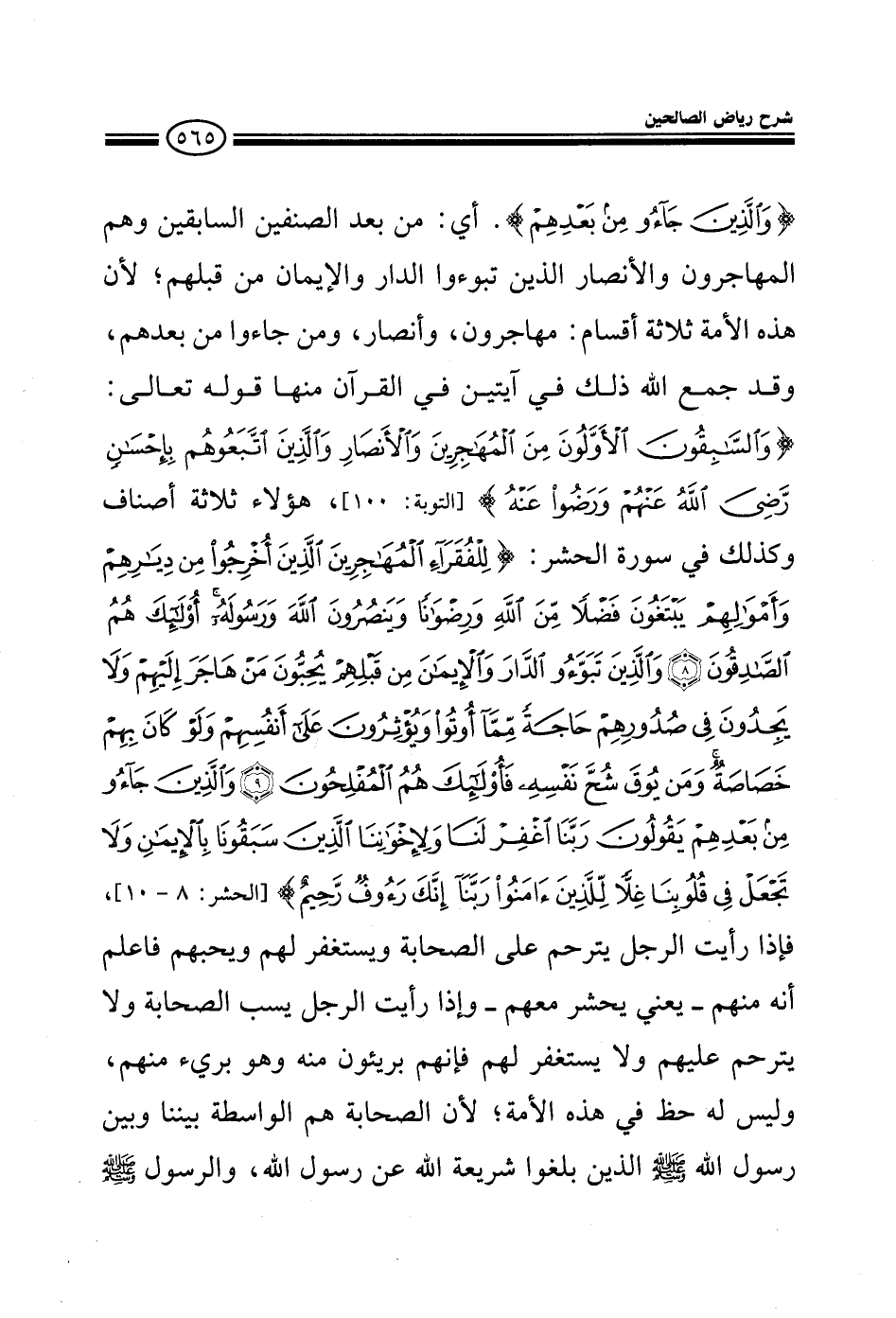{والذين جاءوا من بعدهم} أي من بعد الصنفين السابقين وهم المهاجرون والأنصار الذين تبوءوا الدار والإيمان من قبلهم لأن هذه الأمة ثلاثة أقسام: مهاجرون أنصار ومن جاءوا من بعدهم وقد جمع الله ذلك في آيتين في القرآن منها قوله تعالى {والسابقون الأولون من المهاجرين والأنصار والذين اتبعوهم بإحسان رضي الله عنهم ورضوا عنه} وكذلك في سورة الحشر {للفقراء المهاجرين الذين أخرجوا من ديارهم وأموالهم يبتغون فضلا من الله ورضوانا وينصرون الله ورسوله أولئك هم الصادقون والذين تبوءوا الدار والإيمان من قبلهم يحبون من هاجر إليهم ولا يجدون في صدورهم حاجة مما أوتوا ويؤثرون على أنفسهم ولو كان بهم خصاصة ومن يوق شح نفسه فأولئك هم المفلحون والذين جاءوا من بعدهم يقولون ربنا اغفر لنا ولإخواننا الذين سبقونا بالإيمان} فإذا رأيت الرجل يترحم على الصحابة ويستغفر لهم ويحبهم فاعلم أنه منهم أي يحشر معهم وإذا رأيت الرجل يسب الصحابة ولا يترحم عليهم ولا يستغفر لهم فإنهم بريئون منه وهو بريء منهم وليس له حظ في هذه الأمة لأن الصحابة هم الواسطة بيننا وبين رسول الله صلى الله عليه وسلم الذين بلغوا شريعة الله عن رسول الله، والرسول صلى الله عليه وسلم