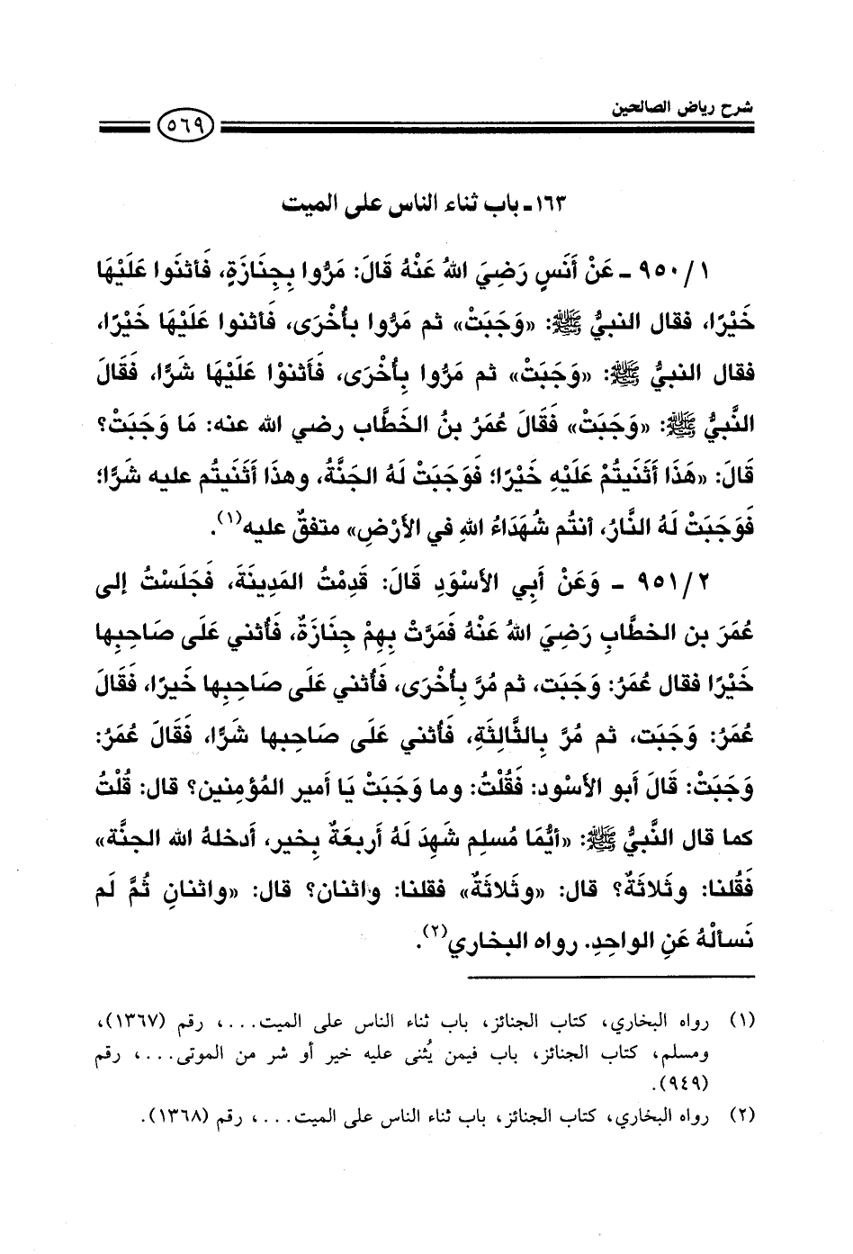 951 - وعن أبي الأسود قال قدمت المدينة فجلست إلى عمر بن الخطاب رضي الله عنه فمرت بهم جنازة فأثنى على صاحبها خيرا فقال عمر وجبت ثم مر بأخرى فأثنى على صاحبها خيرا فقال عمر وجبت ثم مر بالثالثة فأثني على صاحبها شرا فقال عمر وجبت قال أبو الأسود فقلت وما وجبت يا أمير المؤمنين قال قلت كما قال النبي صلى الله عليه وسلم أيما مسلم شهد له أربعة بخير أدخله الله الجنة فقلنا وثلاثة قال وثلاثة فقلنا واثنان قال واثنان ثم لم نسأله عن الواحد رواه البخاري