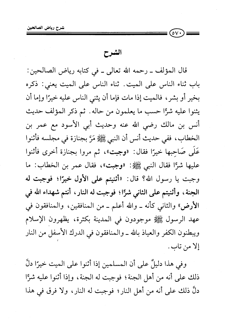 ثم ذكر المؤلف حديث أنس رضي الله عنه وحديث أبي الأسود مع عمر بن الخطاب ففي حديث أنس أن النبي صلى الله عليه وسلم مر بجنازة في مجلسه فأثنوا على صاحبها خيرا فقال وجبت ثم مروا بجنازة أخرى فأثنوا عليها شرا فقال النبي صلى الله عليه وسلم وجبت فقال عمر بن الخطاب ما وجبت يا رسول الله قال أثنيتم على الأول خيرا فوجبت له الجنة وأثنيتم على الثاني شرا فوجبت له النار أنتم شهداء الله في الأرض والثاني كأنه والله أعلم من المنافقين والمنافقون في عهد الرسول صلى الله عليه وسلم موجودون في المدينة بكثرة يظهرون الإسلام ويبطنون الكفر والعياذ بالله والمنافقون في الدرك الأسفل من النار إلا من تاب، وفي هذا دليل على أن المسلمين إذا أثنوا على الميت خيرا دل ذلك على أنه من أهل الجنة فوجبت له الجنة وإذا أثنوا عليه شرا دل ذلك على أنه من أهل النار فوجبت له النار ولا فرق في هذا