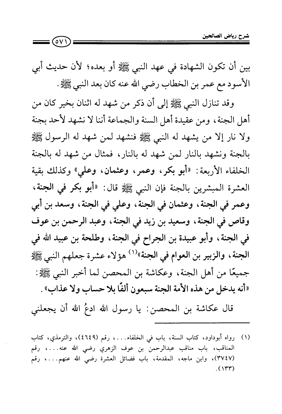 بين أن تكون الشهادة في عهد النبي صلى الله عليه وسلم أو بعده لأن حديث أبي الأسود مع عمر بن الخطاب رضي الله عنه كان بعد النبي صلى الله عليه وسلم وقد تنازل النبي صلى الله عليه وسلم إلى أن ذكر من شهد له اثنان بخير كان من أهل الجنة ومن عقيدة أهل السنة والجماعة أننا لا نشهد لأحد بجنة أو نار إلا من يشهد له النبي صلى الله عليه وسلم فنشهد لمن شهد له الرسول صلى الله عليه وسلم بالجنة ونشهد بالنار لمن شهد له بالنار فمثال من شهد له بالجنة الخلفاء الأربعة (أبو بكر وعمر وعثمان وعلي) وكذلك بقية العشرة المبشرين بالجنة، فإن النبي صلى الله عليه وسلم قال أبو بكر في الجنة وعمر في الجنة وعثمان في الجنة وعلي في الجنة وسعد بن أبي وقاص في الجنة وسعيد بن زيد في الجنة وعبد الرحمن بن عوف في الجنة وأبو عبيدة بن الجراح في الجنة والزبير بن العوام في الجنة هؤلاء عشرة جعلهم النبي صلى الله عليه وسلم جميعا من أهل الجنة وعكاشة بن المحصن لما أخبر النبي صلى الله عليه وسلم أنه يدخل من هذه الأمة سبعون ألفا بلا حساب أو عذاب قال يا رسول الله ادع الله أن يجعلني