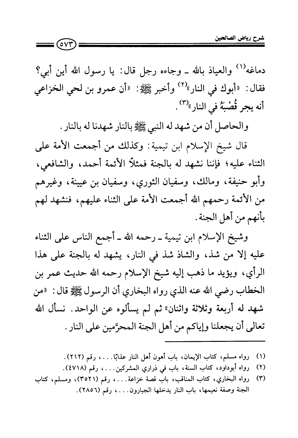 دماغه والعياذ بالله وجاءه رجل فقال يا رسول الله أين أبي فقال أبوك في النار وأخبر أنا عمرو بن لحي الخزاعي يجر قسطه في النار قال شيخ الإسلام ابن تيمية وكذلك من أجمعت الأمة على الثناء عليه فإننا نشهد له بالجنة فمثلا الإمام أحمد رحمه الله الشافعي أبو حنيفة مالك سفيان الثوري سفيان بن عيينة وغيرهم من الأئمة أجمعت الأمة على الثناء عليهم فنشهد لهم بأنهم من أهل الجنة شيخ الإسلام ابن تيمية رحمه الله أجمع الناس بالثناء عليه إلا من شذ ومن شذ شذ في النار يشهد له بالجنة على هذا الرأي ويؤيد هذا الرأي حديث عمر رضي الله عنه الذي رواه البخاري أن الرسول صلى الله عليه وسلم قال من شهد له أربعة وثلاثة واثنان ثم لم يسألوه عن الواحد.