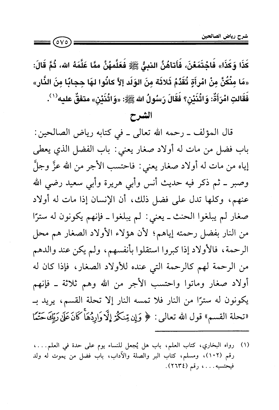 EXقال المؤلف رحمه الله تعالى في كتابه رياض الصالحين باب فضل من مات له أولاد صغار يعني باب الفضل الذي يعطاه من مات له أولاد صغار يعني فاحتسب الأجر من الله عز وجل وصبر ثم ذكر حديث أنس وأبي هريرة وأبي سعيد وكلها تدل على فضل ذلك أن الإنسان إذا مات له أولاد صغار لم يبلغوا الحنث يعني لم يبلغوا فإنهم يكونون له سترا من النار بفضل رحمته إياهم لأن هؤلاء الأولاد الصغار هم محل الرحمة فالأولاد إذا كبروا استقلوا بأنفسهم ولم يكن عند والدهم من الرحمة لهم كالرحمة التي عنده للأولاد الصغار وإذا كان له أولاد صغار وماتوا واحتسب الأجر من الله وهم ثلاثة فإنهم يكونون له سترا من النار فلا تمسهم النار إلا تحلة القسم يريد ب تحلة القسم قوله تعالى وإن منكم إلا واردها كان على ربك حتما