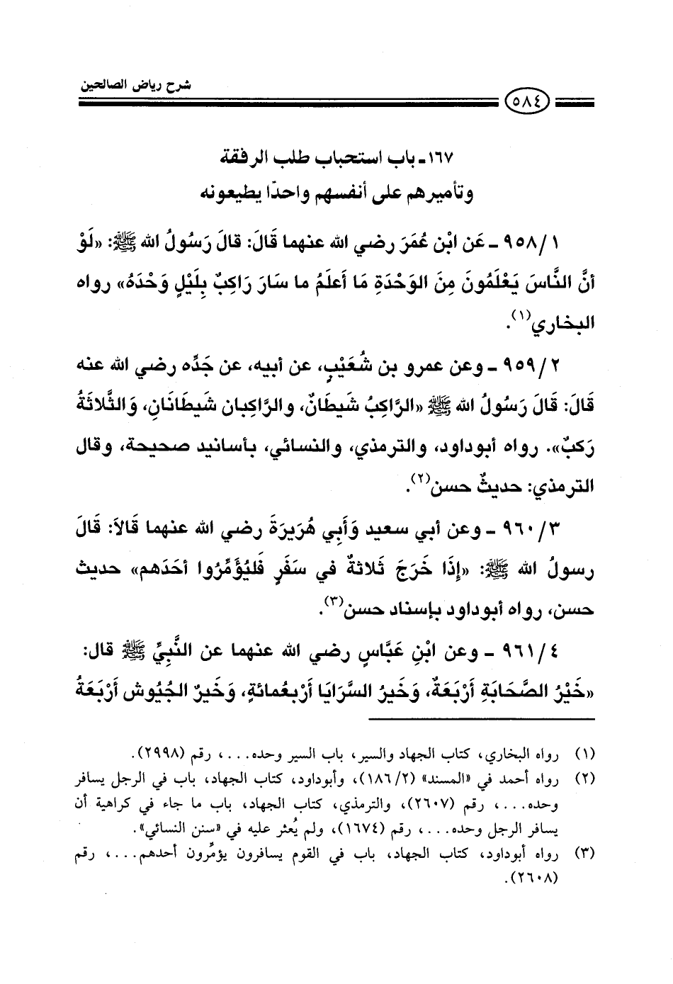 959 - وعن عمرو بن شعيب عن أبيه عن جده رضي الله عنه قل قال رسول الله صلى الله عليه وسلم الراكب شيطان والراكبان شيطانان والثلاثة ركب رواه أبو داود والترمذي والنسائي بأسانيد صحيحة وقال الترمذي حديث حسن