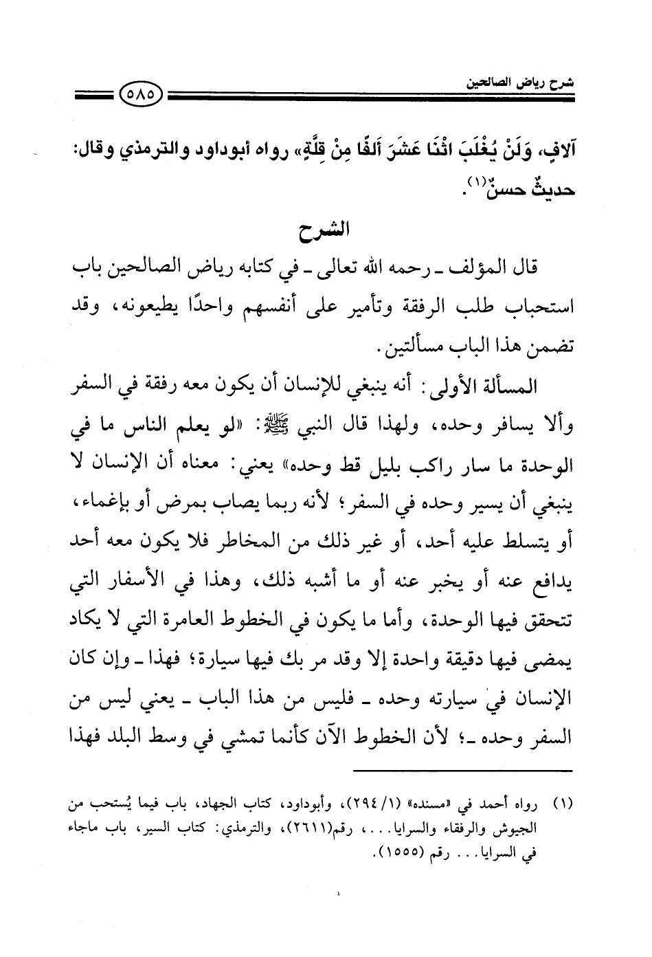 EXقال المؤلف رحمه الله في كتابه رياض الصالحين باب استحباب الرفقة وتأمير أحدهم هذا الباب تضمن مسألتين الأولى أنه ينبغي للإنسان أن يكون معه رفقة في السفر وألا يسافر وحده ولهذا قال النبي صلى الله عليه وسلم لو يعلم الناس ما في الوحدة ما سار راكب بليل قط وحده يعني أن الإنسان لا ينبغي أبدا أن يسير وحده في السفر لأنه ربما يصاب بمرض أو إغماء أو يتسلط عليه أحد أو غير ذلك من المحظورات فلا يكون معه أحد يدافع عنه أو يخبر عنه أو ما أشبه ذلك وهذا في الأسفار التي تتحقق فيها الوحدة وأما ما يكون في الخطوط العامرة التي لا تكاد تمر فيها دقيقة واحدة إلا وتمر بك فيها سيارة فهذا وإن كان الإنسان في سيارة وحده فليس من هذا الباب يعني ليس من باب السفر وحده لأن الخطوط الآن عامرة من محافظة لأخرى ومن مدينة لثانية وما أشبه ذلك
