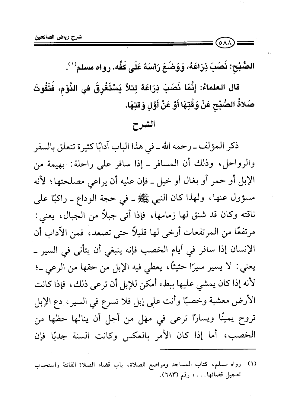 الصبح نصب ذراعه ووضع رأسه على كفه رواه مسلم قال العلماء إنما نصب ذراعه لئلا يستغرق في النوم فتفوت صلاة الصبح عن وقتها أو عن أول وقتها