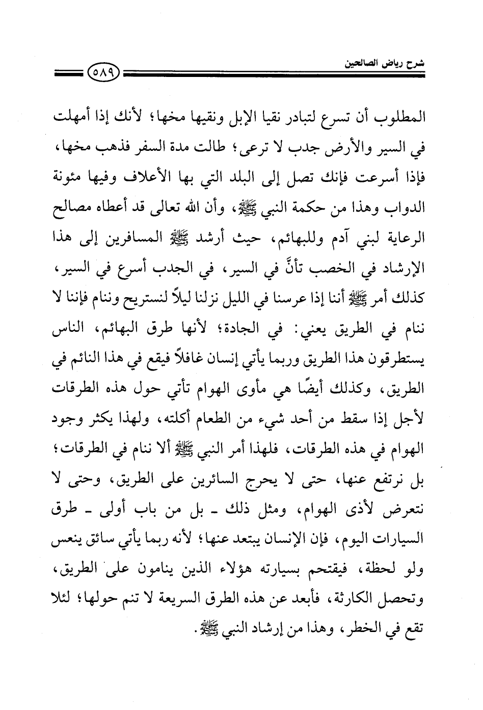 المفروض أن تسرع لأنك إذا أمهلت في السير والأرض جدب لا ترعى طالت مدة السفر فيذهب مخها وهذا من حكمة النبي صلى الله عليه وسلم وأن الله تعالى قد أعطاه مصالح الرعاية للإنسان والبهائم حيث أرشد صلى الله عليه وسلم المسافرين إلى هذه الآداب في الخصب تأن في السير في الجدب أسرع في السير كذلك أمر صلى الله عليه وسلم أننا إذا عرسنا نزلنا ليلا لنستريح ونام فإننا لا ننام في الطريق يعني في الجادة لأنها طرق البهائم الناس يستطرقون هذا الطريق فربما يأتي إنسان غافل فيقع في هذا الطريق كذلك هي أيضا مأوى الهوام تأتي إلى هذه الطرق حتى إذا سقط من أحد شيء من الطعم أكلته ولهذا يكثر وجود الهوام في هذه الطرق فلهذا أمر النبي صلى الله عليه وسلم ألا ننام في الطرقات بل نرتفع عنها حتى لا يحرج السائرين على الطريق وحتى لا تتعرض لأذى الهوام ومثل ذلك بل من باب أولى طرق سيارات اليوم فإن الإنسان يبتعد عنها لأنه ربما يأتي سائق ينعس ولو لحظة فيقتحم بسيارته هؤلاء الذين ينامون على الطريق وتحدث كارثة فابعد عن هذه الطرق السريعة لا تنم حولها حتى لا تقع في الخطر وهذا من إرشاد النبي صلى الله عليه وسلم