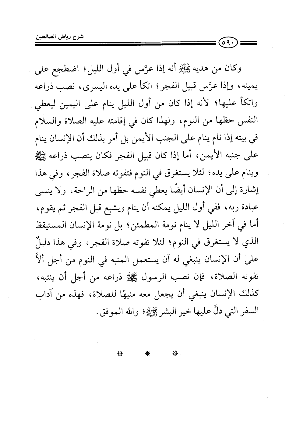 وكان من هديه صلى الله عليه وسلم أنه إذا عرس في أول الليل اضطجع على يمينه وإذ عرس قبيل الفجر اتكأ على يده اليسرى لأن إذا كان أول الليل ينام على اليمين ليعطي النفس حظها من النوم ولهذا كان صلى الله عليه وسلم في بيته إذا نام ينام على الجنب الأيمن بل أمر بذلك أما إذا كان قبيل الفجر فكان ينصب ذراعه صلى الله عليه وسلم وينام على يده لئلا يستغرق في النوم فتفوته صلاة الفجر وفي هذا إشارة إلى أن الإنسان أيضا يعطي نفسه حظها من الراحة ولا ينسى عبادة ربه ففي أول الليل يمكنه أن ينام ويشبع قبل الفجر ثم يقوم أما في آخر الليل فإنه لا ينام نومة المطمئن بل نومة المستيقظ الذي لا يستغرق في النوم لئلا تفوته صلاة الفجر وفي هذا دليل على أن الإنسان ينبغي له أن يستعمل المنبه في النوم ينبهه حتى لا تفوته الصلاة فإن نصب الرسول صلى الله عليه وسلم ذراعه من أجل أن يتنبه كذلك الإنسان ينبغي أن يجعل معه منبها للصلاة فهذا من آداب السفر الذي دل عليها خير البشر صلى الله عليه وسلم والله الموفق