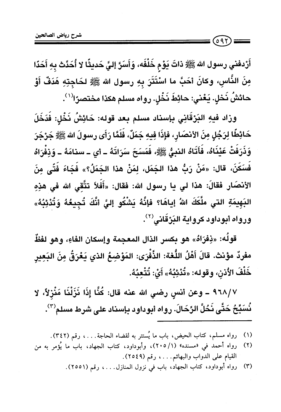 أردفني رسول الله صلى الله عليه وسلم ذات يوم خلفه وأسر إلي حديثا لا أحدث به أحدا من الناس وكان أحب ما استتر به رسول الله صلى الله عليه وسلم لحاجته هدف أو حائش نخل يعني حائط نخل رواه مسلم هكذا مختصرا وزاد فيه البرقاني بإسناد مسلم هذا بعد قوله حائش نخل فدخل حائطا لرجل من الأنصار فإذا فيه جمل فلما رأى رسول الله صلى الله عليه وسلم جرجر وذرفت عيناه فأتاه النبي صلى الله عليه وسلم فمسح سراته أي سنامه وذافره فسكن فقال من رب هذا الجمل لمن هذا الجمل فجاء فتى من الأنصار فقال هذا لي يا رسول الله فقال أفلا تتقي الله في هذه البهيمة التي ملكك الله إياها فإنه يشكو إلي أنك تجيعه وتدئبه ورواه أبو داود كرواية البرقاني قوله ذفراه هو بكسر الذال المعجمة وإسكان الفاء وهو لفظ مفرد مؤنث قال أهل اللغة الذفري الموضع الذي يعرق من البعير خلف الأذن وقوله تدئبه أي تتعبه