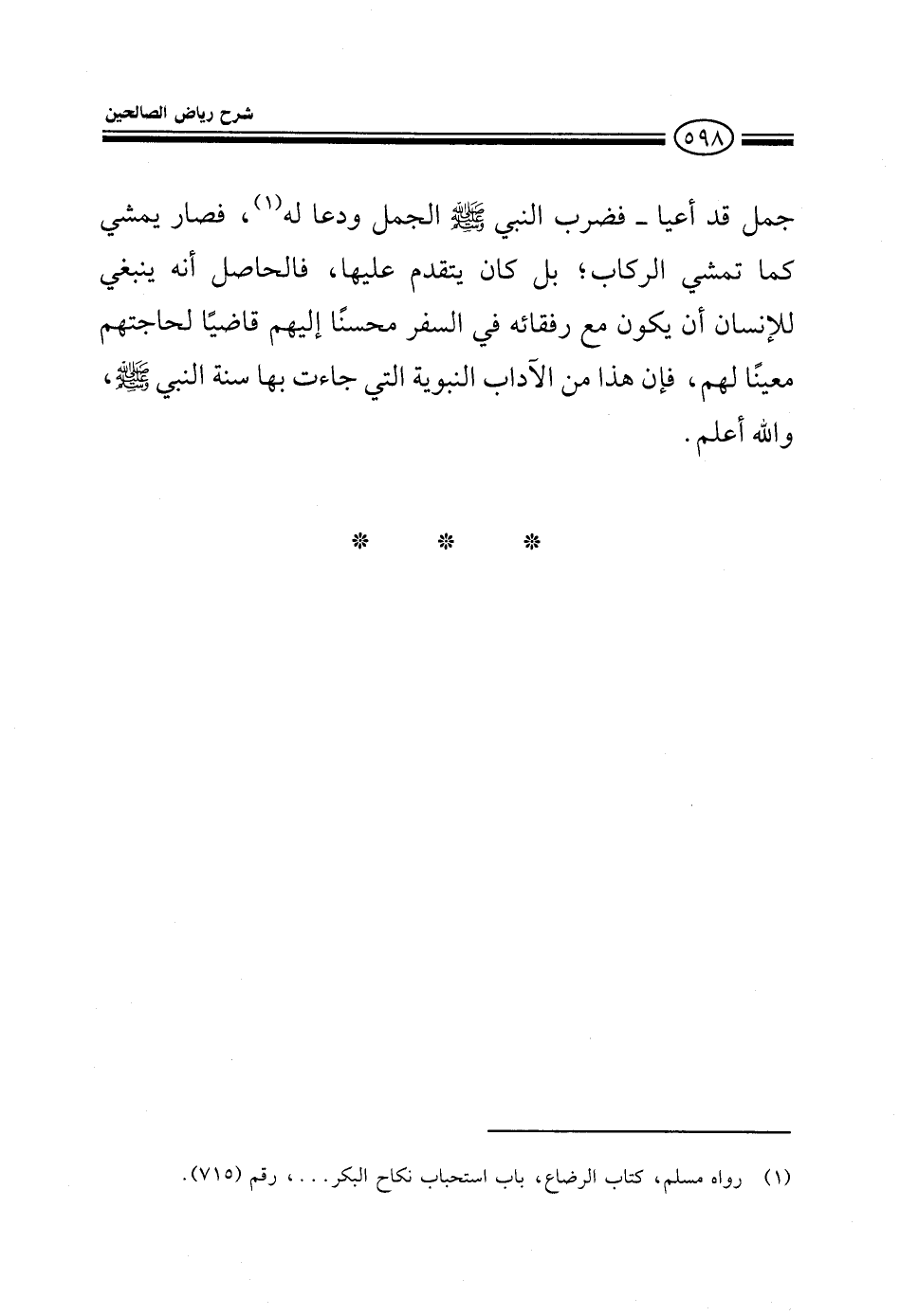 جمل قد أعيا فضربه النبي صلى الله عليه وسلم أي ضرب الجمل ودعا له فصار يمشي كما تمشي الركاب بل كان يتقدم عليها والحاصل أنه ينبغي للإنسان أن يكون مع رفقائه في السفر محسنا إليهم قاضيا لحاجتهم معينا لهم فإن هذا من الآداب النبوية التي جاءت بها سنة النبي صلى الله عليه وسلم والله أعلم