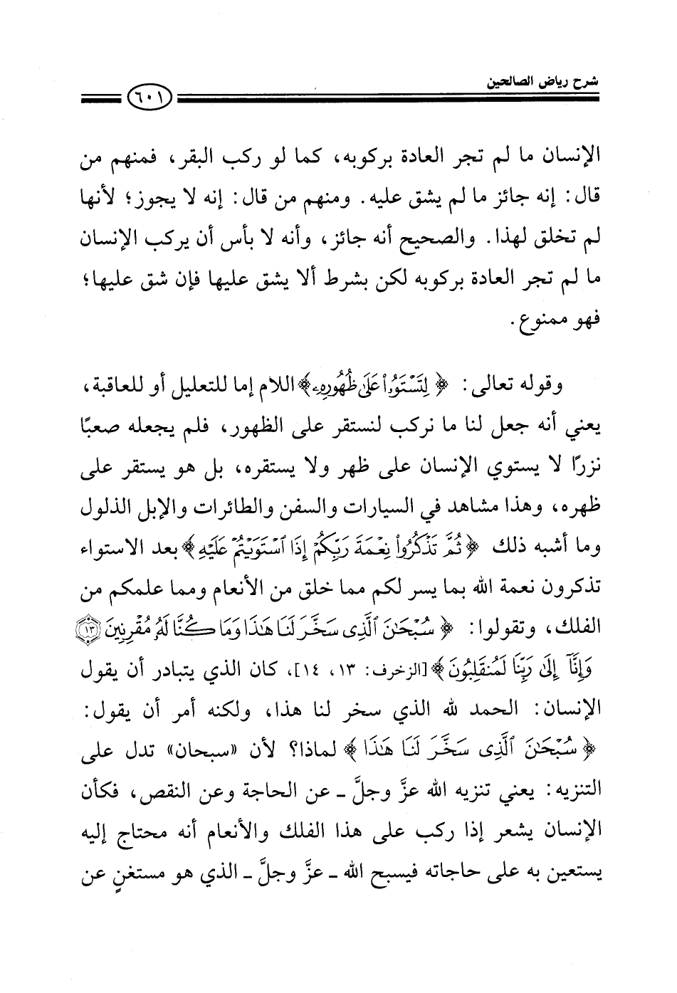 الإنسان ما لم تجر العادة بركوبه، كما لو ركب البقر فمنهم من قال: إنه جائز ما لم يشق عليه ومنهم من قال: إنه لا يجوز لأنها لم تخلق لهذا والصحيح أنه جائز وأنه لا بأس أن يركب الإنسان ما لم تجر العادة بركوبه لكن بشرط ألا يشق عليها فإن شق عليه فهو ممنوع وقوله تعالى: {لتستووا على ظهوره} اللام إما للتعليل أو للعاقبة، يعني أنه جعل لنا ما نركب لنستقر على الظهور، فلم يجعله صعبا نزرا لا يستوي الإنسان على ظهره ولا يستقره، بل هو يستقر على ظهره، وهذا مشاهد في السيارات والسفن والطائرات والإبل الذلول وما أشبه ذلك {ثم تذكروا نعمة ربكم إذا استويتم عليه} بعد الاستواء تذكرون نعمة الله بما يسر لكم مما خلق من الأنعام ومما علمكم من الفلك وتقولوا: {سبحان الذي سخر لنا هذا وما كنا له مقرنين وإنا إلى ربنا لمنقلبون} كان الذي يتبادر أن يقول الإنسان: الحمد لله الذي سخر لنا هذا ولكنه أمر أن يقول: {سبحان الذي سخر لنا هذا} لماذا، لأن (سبحان) تدل على التنزيه: يعني تنزيه الله عز وجل عن الحاجة وعن النقص فكأن الإنسان يشعر إذا ركب على هذه الفلك والأنعام أنه محتاج إليه يستعين به على حاجاته فيسبح الله عز وجل الذي هو مستغن عن
