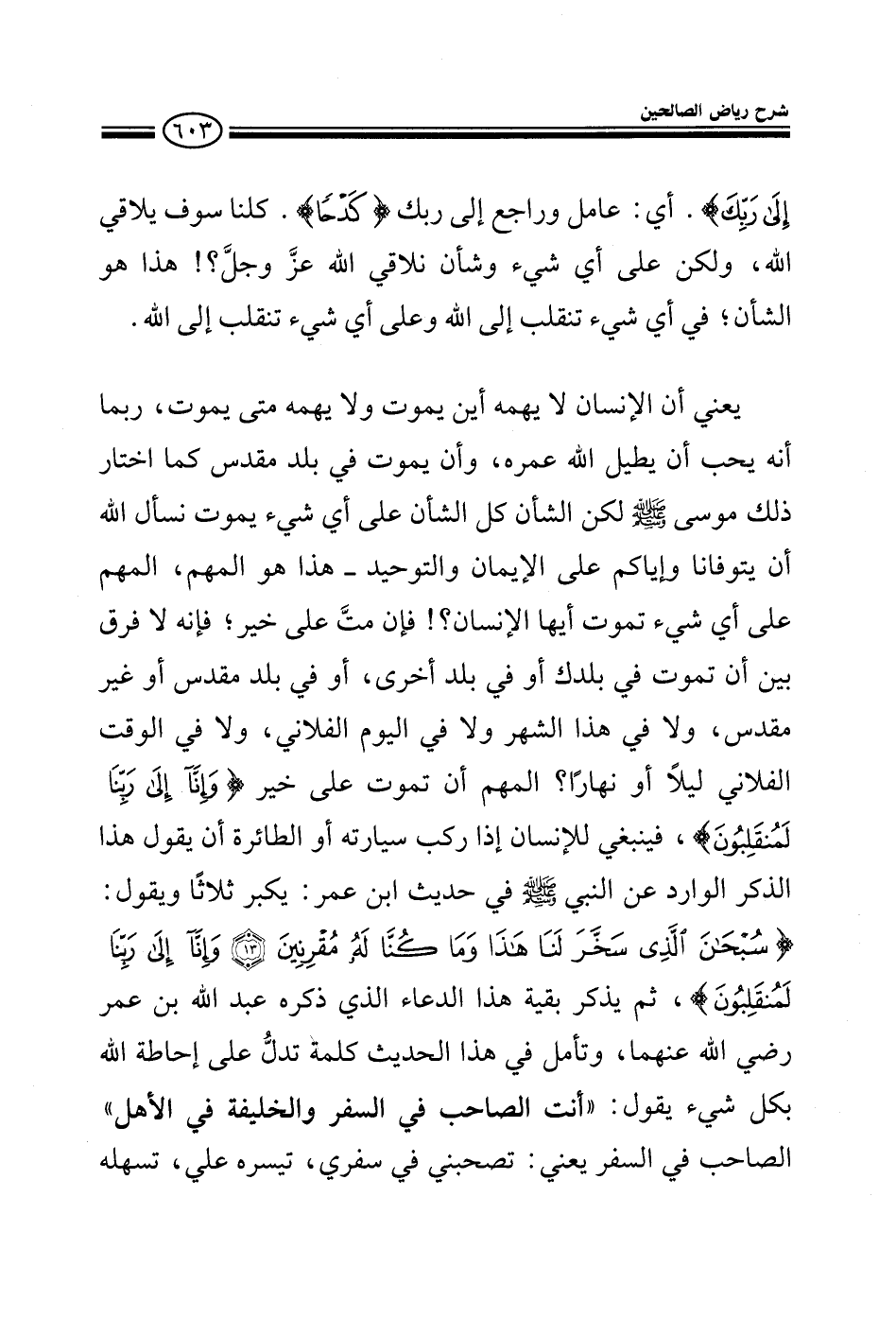 إلى ربك {أي: عامل وراجع إلى ربك} فملاقيه {كلنا سوف يلاقي الله، ولكن على أي شيء وشأن نلاقي الله عز وجل؟ يعني: الإنسان لا يهمه أين يموت ولا متى يموت ربما أنه يحب أن يطيل الله عمره وأن يموت في بلد مقدس كما اختار ذلك موسى صلى الله عليه وسلم لكن الشأن كل الشأن على أي شيء يموت نسأل الله أن يتوفانا وإياكم على الإيمان والتوحيد هذا هو المهم فإن مت على خير فإنه لا فرق أن تموت هنا أوهناك أو في بلد مقدس أو غير مقدس ولا في هذا الشهر ولا في هذا اليوم ولا في هذا الوقت المهم أن تموت على خير فينبغي للإنسان إذا ركب سيارته أو الطائرة أن يقول هذا الذكر الوارد عن النبي صلى الله عليه وسلم في حديث ابن عمر: يكبر ثلاثا ويقول:} سبحان الذي سخر لنا هذا وما كنا له مقرنين وإنا إلى ربنا لمنقلبون {ثم يدعو بهذا الدعاء الذي ذكره ابن عمر رضي الله عنهما وتأمل في هذا الحديث كلمة تدل على إحاطة الله بكل شيء يقول: أنت الصاحب في السفر والخليفة في الأهل الصاحب في السفر يعني تصحبني في سفري، تيسره علي، تسهله