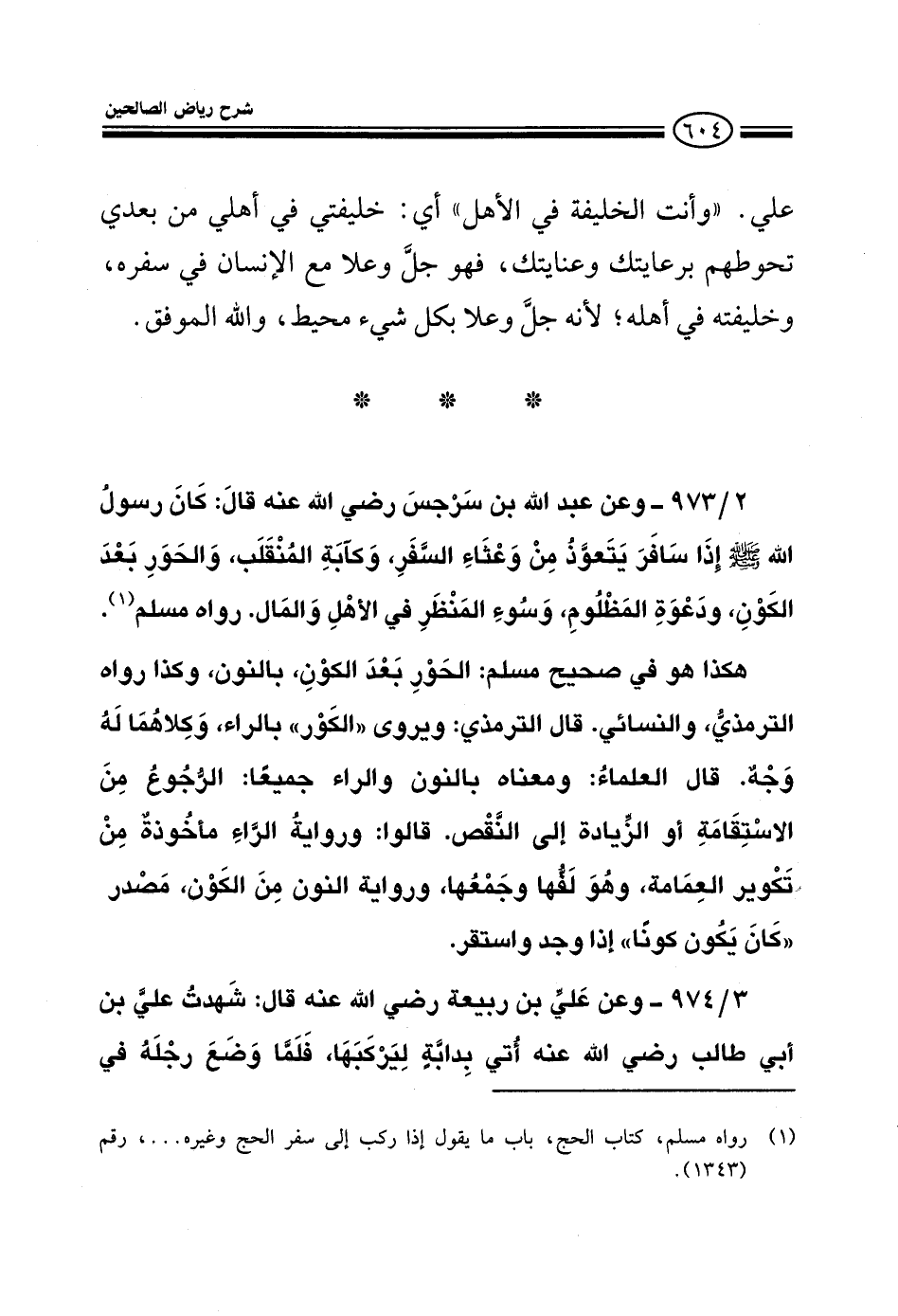 973 - وعن عبد الله بن سرجس رضي الله عنه قال: كان رسول الله صلى الله عليه وسلم سافر يتعوذ من وعثاء السفر، وكآبة المنقلب، والحور بعد الكون، ودعوة المظلوم.