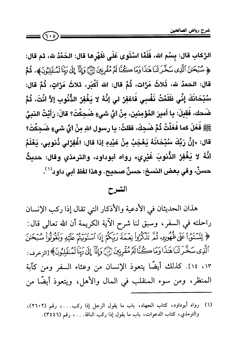 الركاب قال: بسم الله، فلما استوى على ظهرها قال: الحمد لله الذي سخر لنا هذا وما كنا مقرنين، وإنا إلى ربنا لمنقلبون، ثم قال: الحمد لله ثلاث مرات، ثم قال: الله أكبر ثلاث مرات، ثم قال: سبحانك إني ظلمت نفسي فاغفر لي إنه لا يغفر الذنوب إلا أنت، ثم ضحك، فقيل: يا أمير المؤمنين، من أي شيء ضحكت؟ قال: رأيت النبي صلى الله عليه وسلم فعل كما فعلت، ثم ضحك فقلت: يا رسول الله من أي شيء ضحكت؟ قال: إن ربك سبحانه يعجب من عبده إذا قال: اغفر لي ذنوبي، يعلم أنه لا يغفر الذنوب غيري رواه أبو داود والترمذي وقال: حديث حسن، وفي بعض النسخ: حسن صحيح.