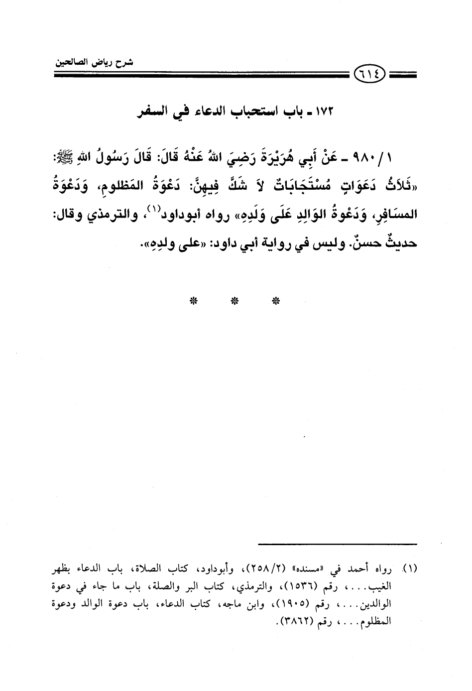 980 - عن أبي هريرة رضي الله عنه قال: قال رسول الله صلى الله عليه وسلم: ثلاث دعوات مستجابات لا شك فيهن: دعوة المظلوم، ودعوة المسافر، ودعوة الوالد على ولده رواه أبو داود، والترمذي وقال: حديث حسن وليس في رواية أبي داود: على ولده
