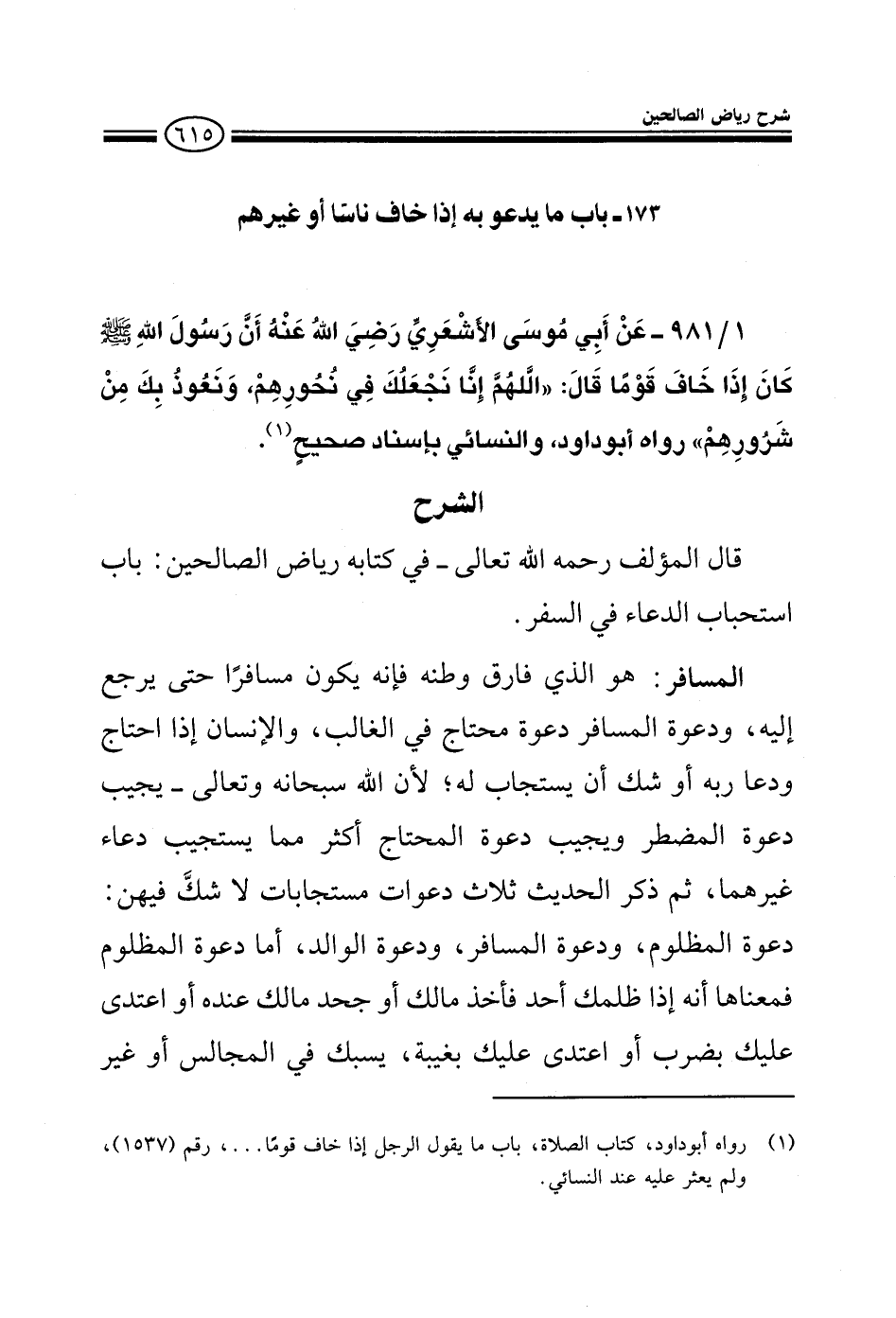 981 - عن أبي موسى الأشعري رضي الله عنه أن رسول الله صلى الله عليه وسلم كان إذا خاف قوما قال: اللهم إنا نجعلك في نحورهم، ونعوذ بك من شرورهم رواه أبو داود، والنسائي بإسناد صحيح
