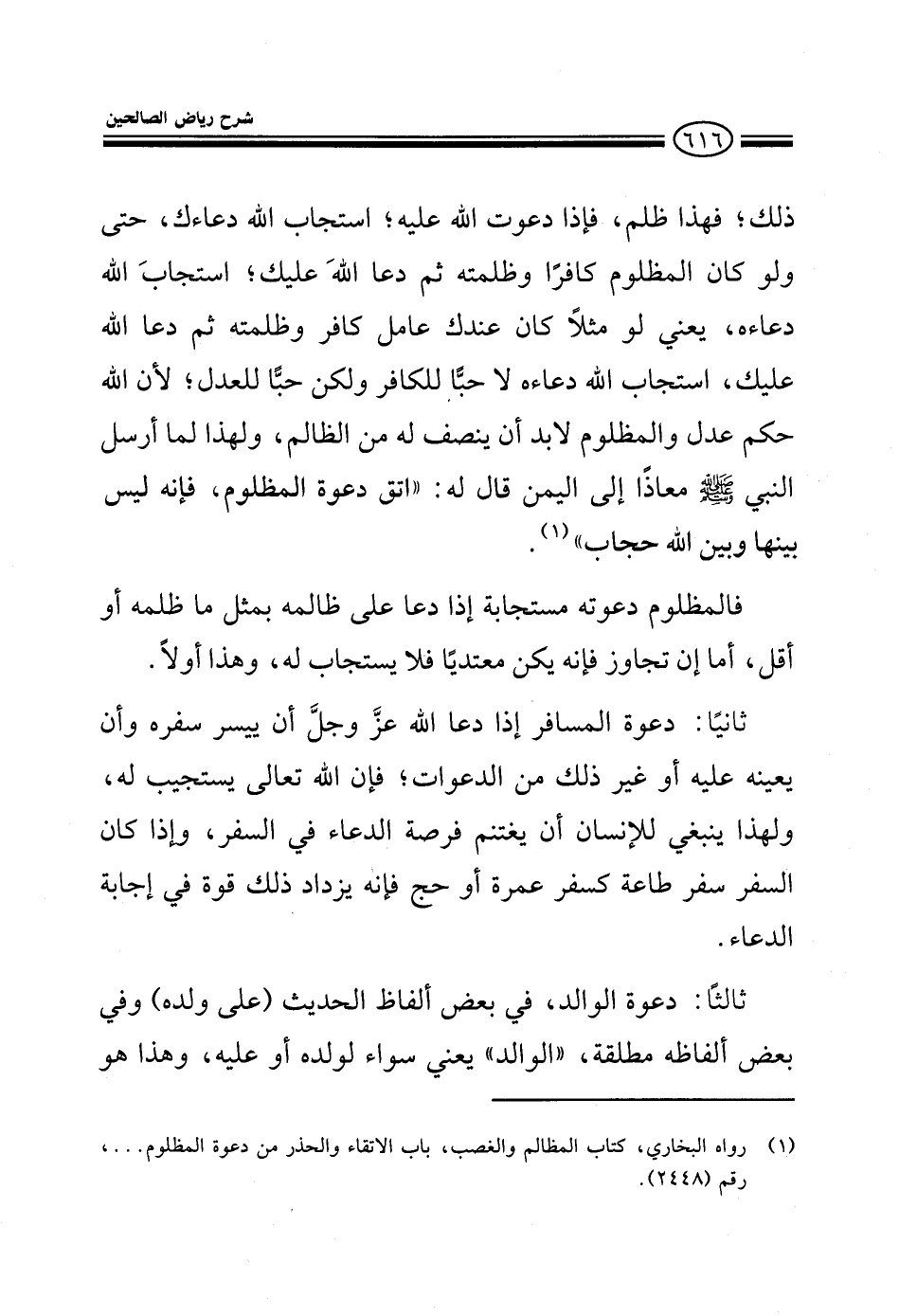 ذلك فهذا ظلم فإذا دعوت الله عليه استجاب الله دعاءك، حتى ولو كان المظلوم كافرا وظلمته ثم دعا الله فإن الله يستجيب دعاءه، ولا حبا للكافر ولكن حبا للعدل، والمظلوم لابد أن ينصف له من الظالم ولهذا لما أرسل النبي صلى الله عليه وسلم معاذا إلى اليمن قال له: اتق دعوة المظلوم فإنه ليس بينها وبين الله حجاب فالمظلوم دعوته مستجابة إذا دعا على ظالمه بمثل ما ظلمه أو أقل إما إذا تجاوز فإنه يكون معتديا فلا يستجاب له هذه واحدة الثانية: دعوة المسافر إذا دعا الله عز وجل أن ييسر سفره أو يعينه عليه أو غير ذلك من الدعوات فإن الله تعالى يستجيب له ولذا ينبغي أن يغتنم فرصة الدعاء في السفر وإذا كان السفر سفر طاعة كعمرة وحج فإنه يزداد ذلك قوة في إجابة الدعاء الثالثة: دعوة الوالد في بعض ألفاظ الحديث على (ولده) وفي بعض ألفاظه مطلقة (الوالد) أي سواء دعا لولده أو عليه وهذا هو