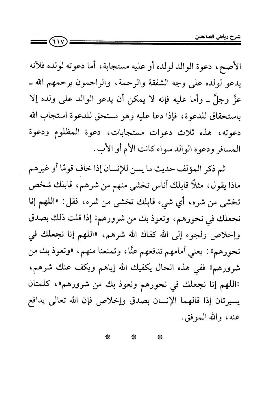 الأصح دعوة الوالد لولده أو عليه مستجابة أما دعوته لولده فلأنه يدعو لولده شفقة ورحمة والراحمون يرحمهم الله عز وجل وأما عليه فإنه لا يمكن أن يدعو على ولده إلا باستحقاق فإذا دعا عليه وهو مستحق لها استجاب الله دعوته هذه ثلاث دعوات مستجابات دعوة المظلوم والمسافر والوالد سواء الأم أو الأب ثم ذكر المؤلف حديثا فيما يسن للإنسان إذا خاف ناسا أو غيرهم ماذا يقول، مثلا قابلك أناس تخشى منهم قابلك شخص تخشى من شره فقل: اللهم إنا نجعلك في نحورهم ونعوذ بك من شرورهم إذا قلت ذلك بصدق وإخلاص ولجوء إلى الله كفاك الله شرهم (اللهم إنا نجعلك في نحورهم) : أي أمامهم تدفعهم عنا وتمنعنا منهم (ونعوذ بك من شرورهم) ففي هذه الحال يكفيك الله شرهم، كلمتان يسيرتان إذا قالهما الإنسان بصدق وإخلاص فإن الله تعالى يستجيب له والله الموفق