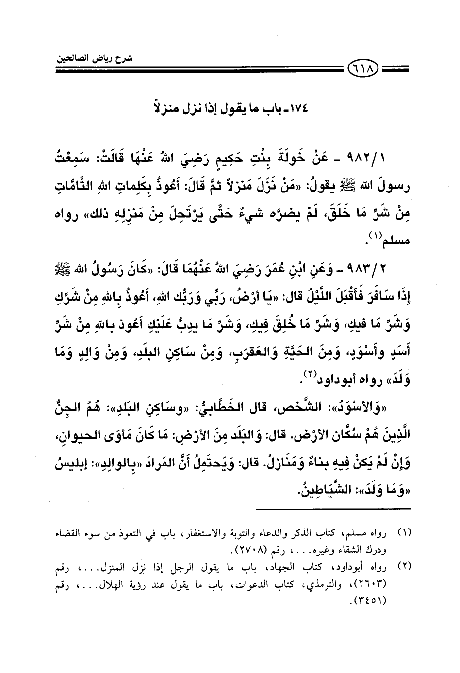982 - عن خولة بنت حكيم رضي الله عنها قالت: سمعت رسول الله صلى الله عليه وسلم يقول: من نزل منزلا ثم قال: أعوذ بكلمات الله التامات من شر ما خلق لم يضره شيء حتى يرتحل من منزله ذلك رواه مسلم