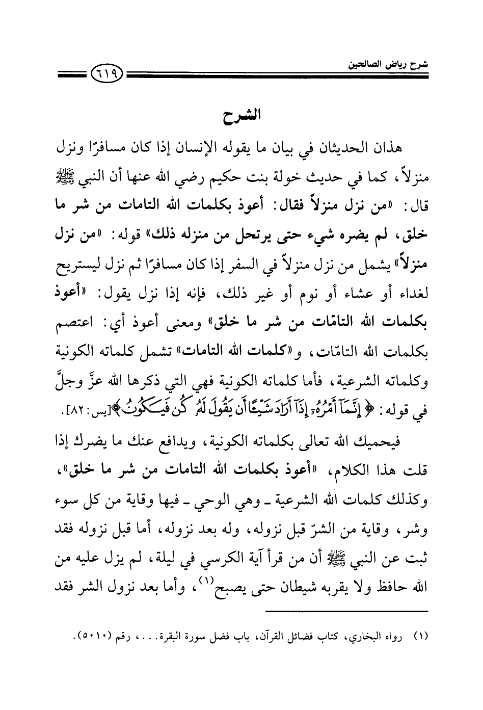 EXهذان الحديثان في بيان ما يقوله الإنسان إذا كان مسافرا ونزل منزلا ففي حديث خولة بنت حكيم رضي الله عنها أن النبي صلى الله عليه وسلم قال: من نزل منزلا فقال: أعوذ بكلمات الله التامات من شر ما خلق لم يضره شيء حتى يرتحل من منزله هذا قوله: نزل منزلا يشمل من نزل منزلا في السفر إذا كان مسافرا ثم نزل ليستريح لغداء أو عشاء أو نوم أو غير ذلك فإنه إذا نزل يقول: أعوذ بكلمات الله التامات من شر ما خلق وأعوذ أي: أعتصم بكلمات الله التامات، وكلمات الله التامات تشمل كلماته الكونية والشرعية فأما الكونية فهي التي ذكرها الله في قوله إنما أمره إذا أراد شيئا أن يقول له كن فيكون فيحميك الله تعالى بكلماته الكونية يدفع عنك ما يضرك إذا قلت هذا الكلام كذلك الكلمات الشرعية وهي الوحي فيها وقاية من كل سوء وشر وقاية من الشر قبل نزوله أما قبل نزوله فقد ثبت عن النبي صلى الله عليه وسلم أن من قرأ آية الكرسي في ليلة لم يزل عليه من الله حافظ ولا يقربه شيطان حتى يصبح وأما بعد نزول الأثر فقد
