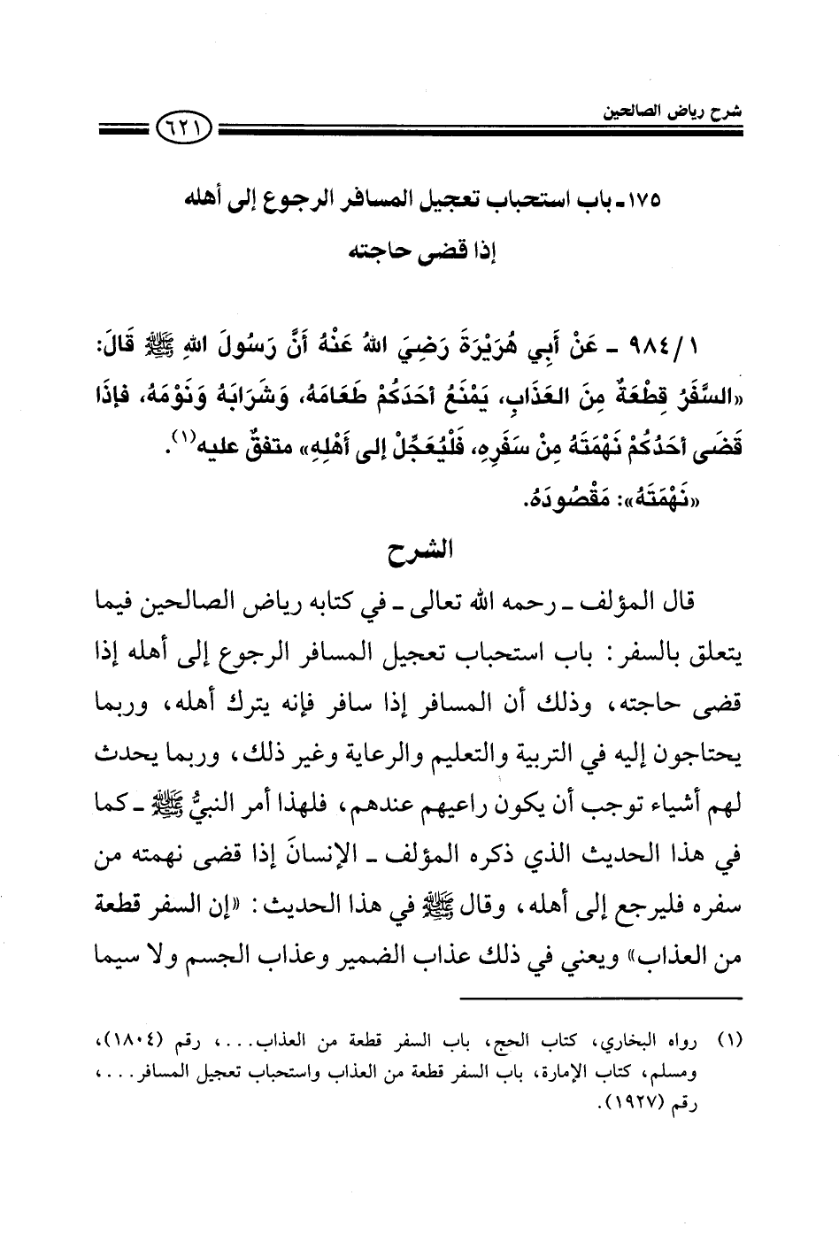984 - عن أبي هريرة رضي الله عنه أن رسول الله صلى الله عليه وسلم قال السفر قطعة من العذاب يمنع أحدكم طعامه وشرابه ونومه فإذا قضى أحدكم نهمته من سفره فليعجل إلى أهله متفق عليه نهمته مقصوده