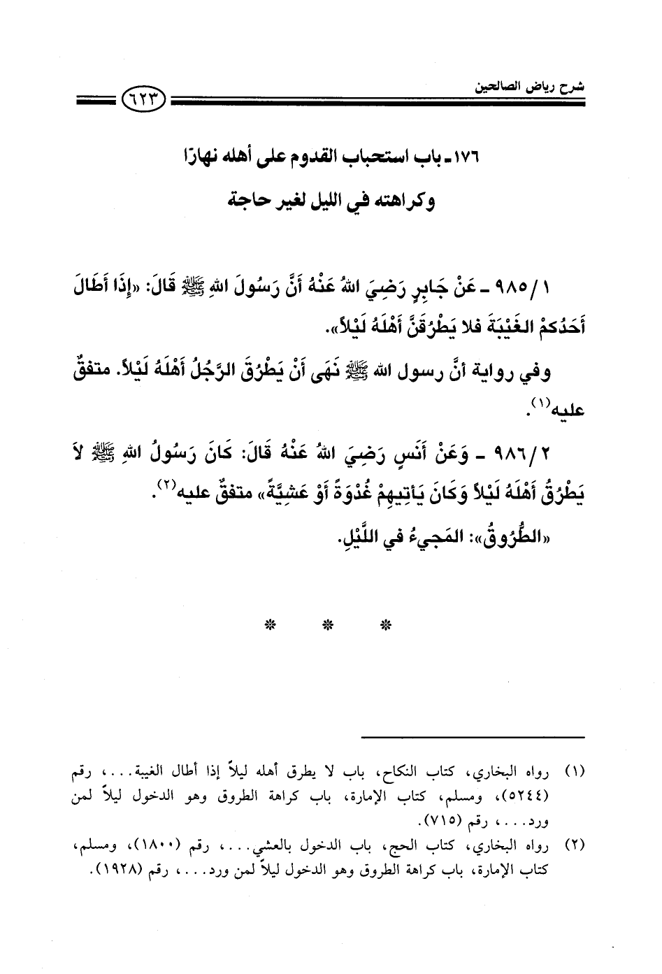 986 - وعن أنس رضي الله عنه قال كان رسول الله صلى الله عليه وسلم لا يطرق أهله ليلا وكان يأتيهم غدوة أو عشية متفق عليه الطروق المجيء في الليل