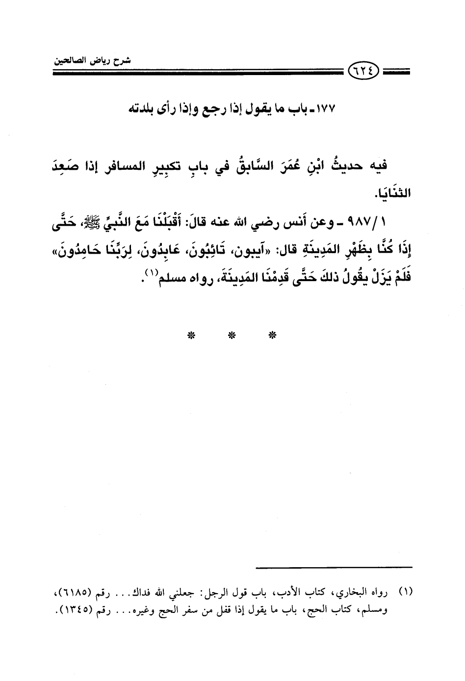 987 - وعن أنس رضي الله عنه قال أقبلنا مع النبي صلى الله عليه وسلم حتى إذا كنا بظهر المدينة قال آيبون تائبون عابدون لربنا حامدون فلم يزل يقول ذلك حتى قدمنا المدينة رواه مسلم