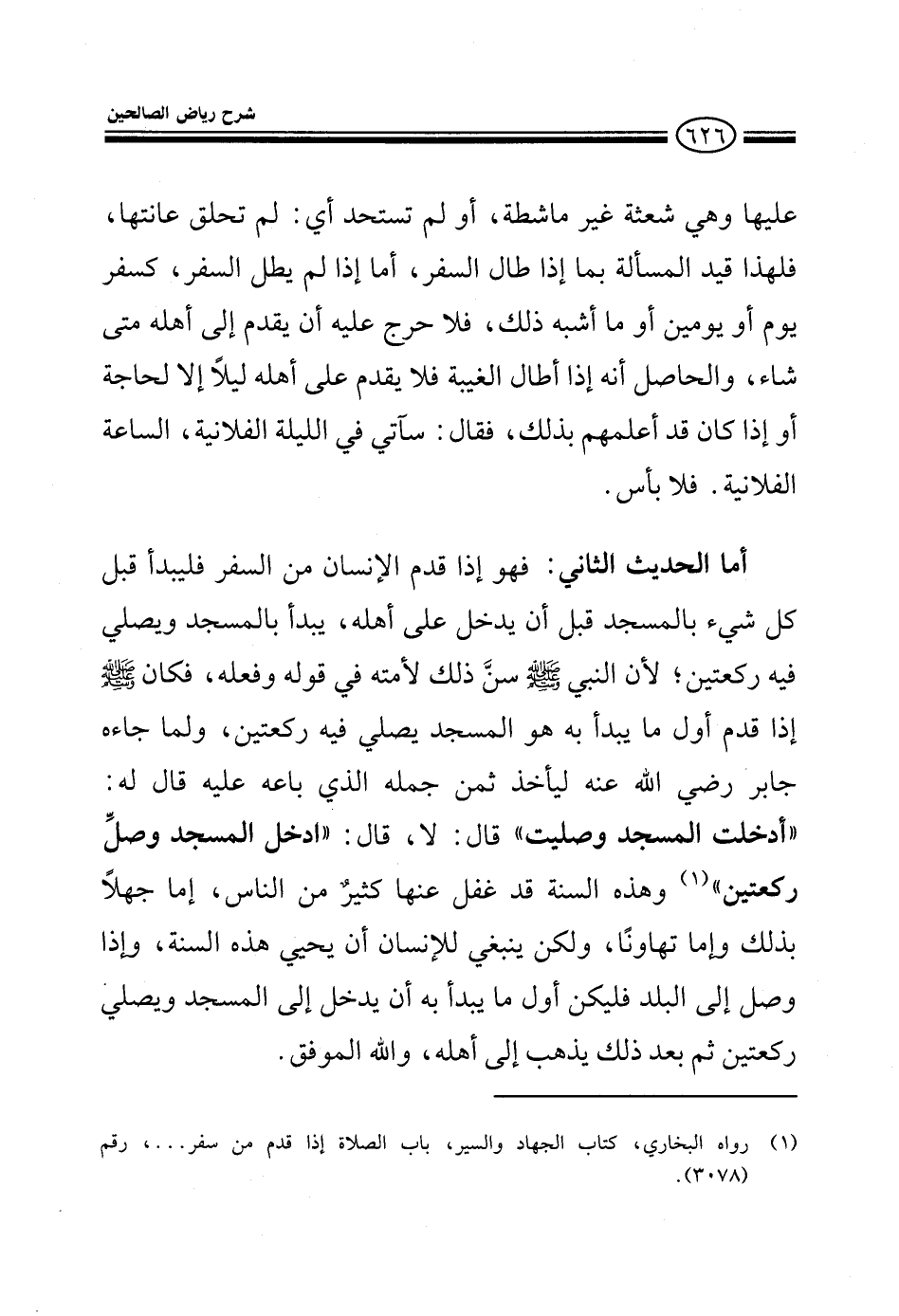 عليها وهي شعثة غير ماشطة أو لم تستحد أي لم تحلق عانتها فلهذا قيد المسألة إذا أطال السفر أما إذا لم يطل السفر كسفر يوم أو يومين أو ما أشبه ذلك فلا حرج عليه أن يقدم إلى أهله متى شاء والحاصل أنه إذا أطال الغيبة فلا يقدم على أهله ليلا إلا لحاجة أو إعلام فلا بأس أما الحديث الثاني فهو إذا قدم الإنسان من السفر فليبدأ قبل كل شيء بالمسجد قبل أن يدخل على أهله يبدأ بالمسجد ويصلى فيه ركعتين لأن النبي صلى الله عليه وسلم سن ذلك لأمته في قوله وفعله فكان صلى الله عليه وسلم إذا قدم أول ما يبدأ به هو المسجد يصلي فيه ركعتين ولما جاءه جابر رضي الله عنه ليأخذ ثمن جمله الذي باعه عليه قال له أدخلت المسجد وصليت قال لا قال ادخل المسجد وصل ركعتين وهذه السنة قد غفل عنها كثير من الناس إما جهلا بذلك وإما تهاونا ولكن ينبغي للإنسان أن يحيي هذه السنة وإذا وصل إلى البلد فليكن أول ما يبدأ به أن يدخل إلى المسجد ويصلي ركعتين ثم بعد ذلك يذهب إلى أهله والله الموفق
