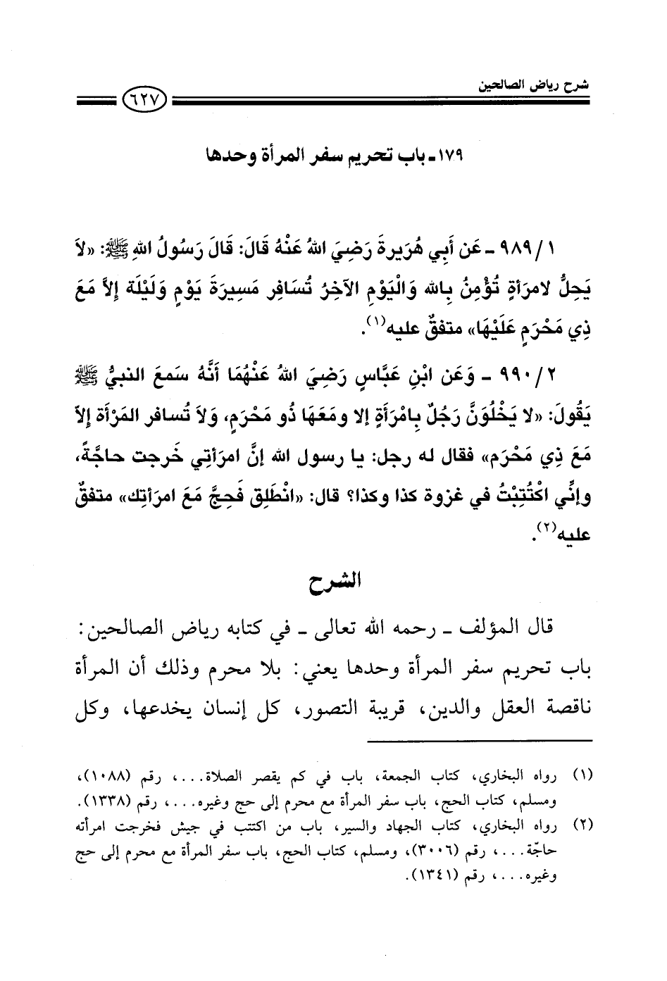 EXذكر المؤلف رحمه الله في كتاب (رياض الصالحين) باب تحريم سفر المرأة وحدها يعني بلا محرم وذلك أن المرأة ناقصة العقل والدين كل إنسان يخدعها وكل