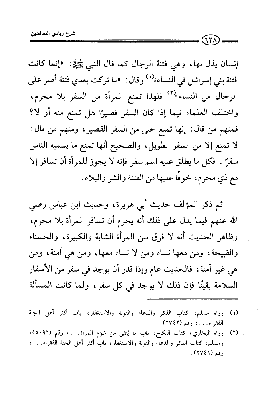 إنسان يذل بها وهي فتنة الرجال كما قال النبي صلى الله عليه وسلم إنما كانت فتنة بني إسرائيل في النساء وقال ما تركت بعدي فتنة أضر على الرجال من النساء فلهذا تمنع المرأة من السفر بلا محرم واختلف العلماء فيما إذا كان السفر قصيرا هل تمنع منه أم لا فمنهم من قال بالمنع حتى من السفر القصير ومنهم من قال لا تمنع إلا من السفر الطويل والصحيح أنها تمنع مما يسميه الناس سفرا فكل ما يطلق عليه اسم سفر فإنه لا يجوز للمرأة أن تسافر إلا مع ذي محرم خوفا عليها من الفتنة والشر والبلاء ثم ذكر المؤلف حديث أبي هريرة وابن عباس رضي الله عنهم فيما يدل على أنه يحرم أن تسافر المرأة بلا محرم وظاهر الحديث أنه لا فرق بين المرأة الشابة والكبيرة والحسناء والقبيحة ومن معها نساء ومن لا نساء معها ومن هي آمنة وغير آمنة فالحديث عام وإذا قدر أن يوجد في سفر من الأسفار السلامة يقينا فإن ذلك لا يوجد في كل سفر ولما كانت المسألة