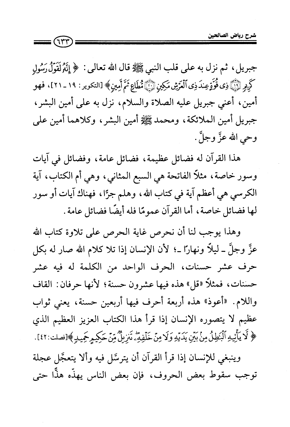 جبريل ثم نزل به على قلب النبي صلى الله عليه وسلم قال الله تعالى {إنه لقول رسول كريم ذي قوة عند ذي العرش مكين مطاع ثم أمين} فهو أمين أعني جبريل عليه الصلاة والسلام نزل به على أمين البشر جبريل أمين الملائكة ومحمد أمين البشر وكلاهما أمين على وحي الله عز وجل هذا القرآن له فضائل عظيمة فضائل عامة وفضائل في آيات وسور خاصة مثلا الفاتحة هي السبع المثاني وهي أم الكتاب آية الكرسي هي أعظم آية في كتاب الله وهلم جرا هناك آيات أو سور لها فضل خاصة أما القرآن عموما فله أيضا فضائل عامة وهذا يوجب علينا أن نحرص غاية الحرص على تلاوة كتاب الله عز وجل ليلا ونهارا لأن الإنسان إذا تلا كلام الله صار له بكل حرف بكل حرف عشر حسنات الحرف الواحد من الكلمة له فيه عشر حسنات فمثلا (قل) فيها عشرون حسنة لأنها حرفان القاف واللام (أعوذ) هذه أربعة أحرف فيها أربعون حسنة وهذا ثواب عظيم لا يتصور الإنسان إذا قرأ هذا الكتاب العزيز العظيم الذي {لا يأتيه الباطل من بين يديه ولا من خلفه تنزيل من حكيم حميد} وينبغي إذا قرأ القرآن أن يترسل فيه وألا يتعجل عجلة توجب سقوط بعض الحروف فإن بعض الناس يهذه هذا حتى