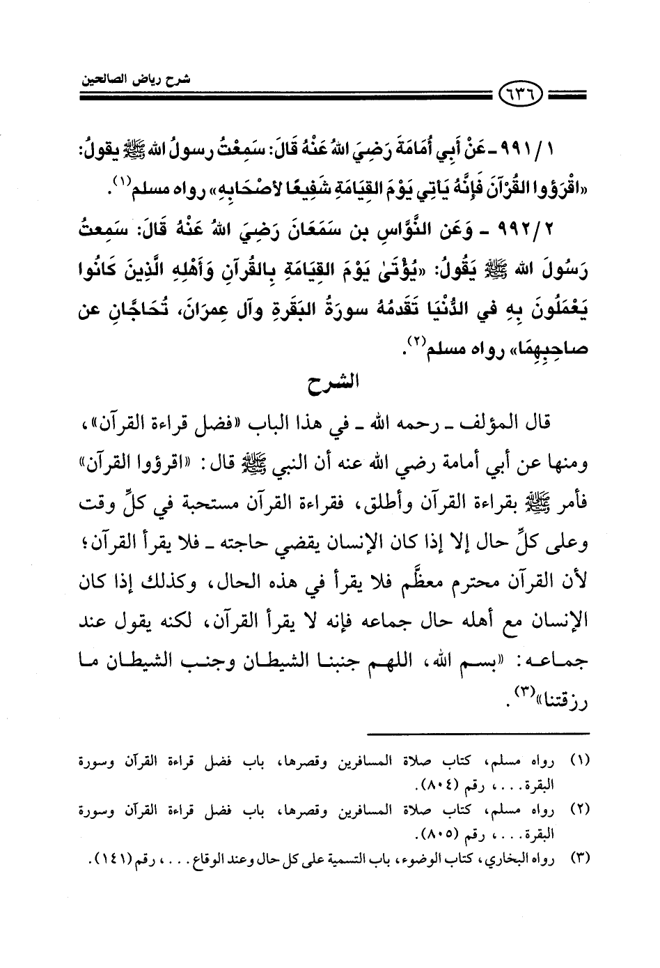 991 - عن أبي أمامة رضي الله عنه قال سمعت رسول الله صلى الله عليه وسلم يقول اقرءوا القرآن فإنه يأتي يوم القيامة شفيعا لأصحابه رواه مسلم