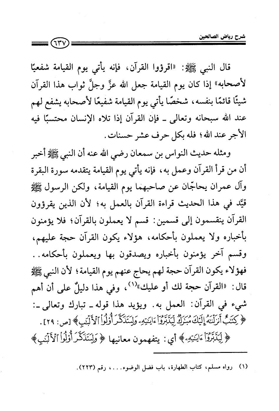 قال النبي صلى الله عليه وسلم اقرءوا القرآن فإنه يأتي يوم القيامة شفيعا لأصحابه إذا كان يوم القيامة جعل الله عز وجل ثواب هذا القرآن شيئا قائما بنفسه يأتي يوم القيامة شفيعا لأصحابه يشفع لهم عند الله سبحانه وتعالى فإن القرآن إذا تلاه الإنسان محتسبا فيه الأجر عند الله فله بكل حرف عشر حسنات ومثله حديث النواس بن سمعان رضي الله عنه أن النبي صلى الله عليه وسلم أخبر أن من قرأ القرآن وعمل به فإنه يأتي يوم القيامة يتقدمه سورة البقرة وآل عمران يحاجان عن صاحبهما يوم القيامة ولكن الرسول صلى الله عليه وسلم قيد في هذا الحديث قراءة القرآن بالعمل به لأن الذين يقرءون القرآن ينقسمون إلى قسمين قسم لا يعمل به فلا يؤمنون بأخباره ولا يعملون بأحكامه هؤلاء يكون القرآن حجة عليهم وقسم آخر يؤمنون بأخباره ويصدقون بها ويعملون بأحكامه فهؤلاء يكون القرآن حجة لهم يحاج عنهم يوم القيامة لأن النبي صلى الله عليه وسلم قال القرآن حجة لك أو عليك وفي هذا دليل على أن أهم شيء في القرآن العمل به ويؤيد هذا قوله تعالى كتاب أنزلناه إليك مباركا ليدبروا آياته وليتذكر أولو الألباب أي يتفهمون معانيها